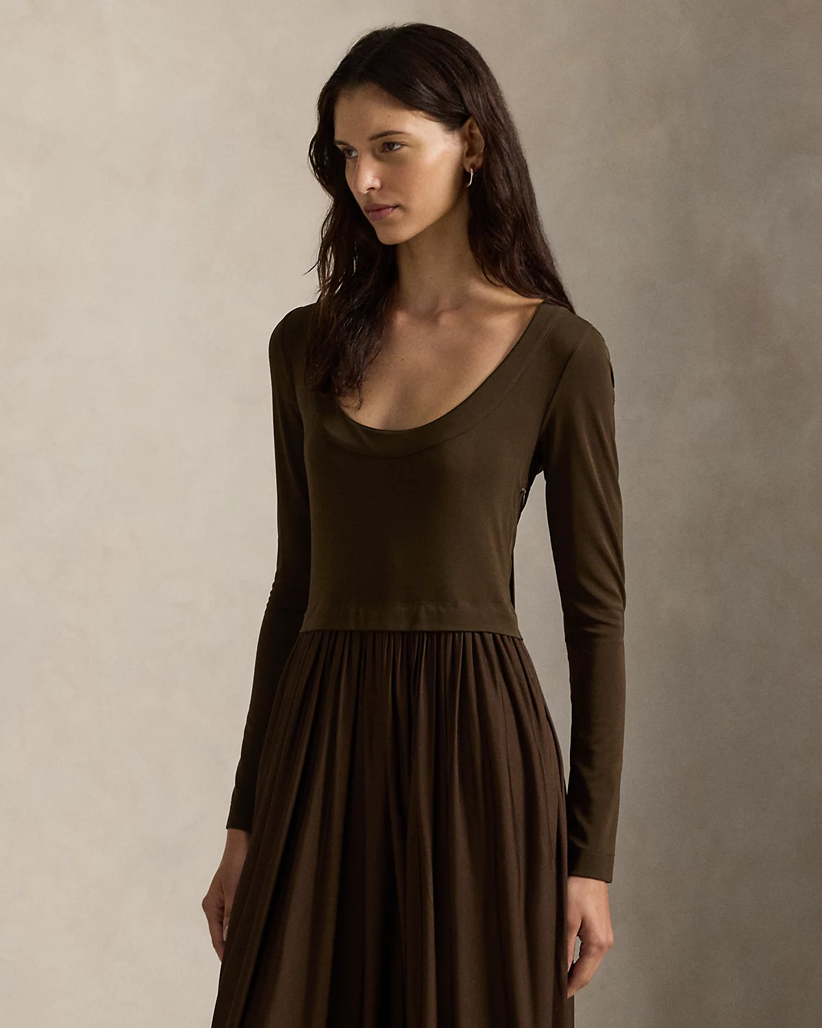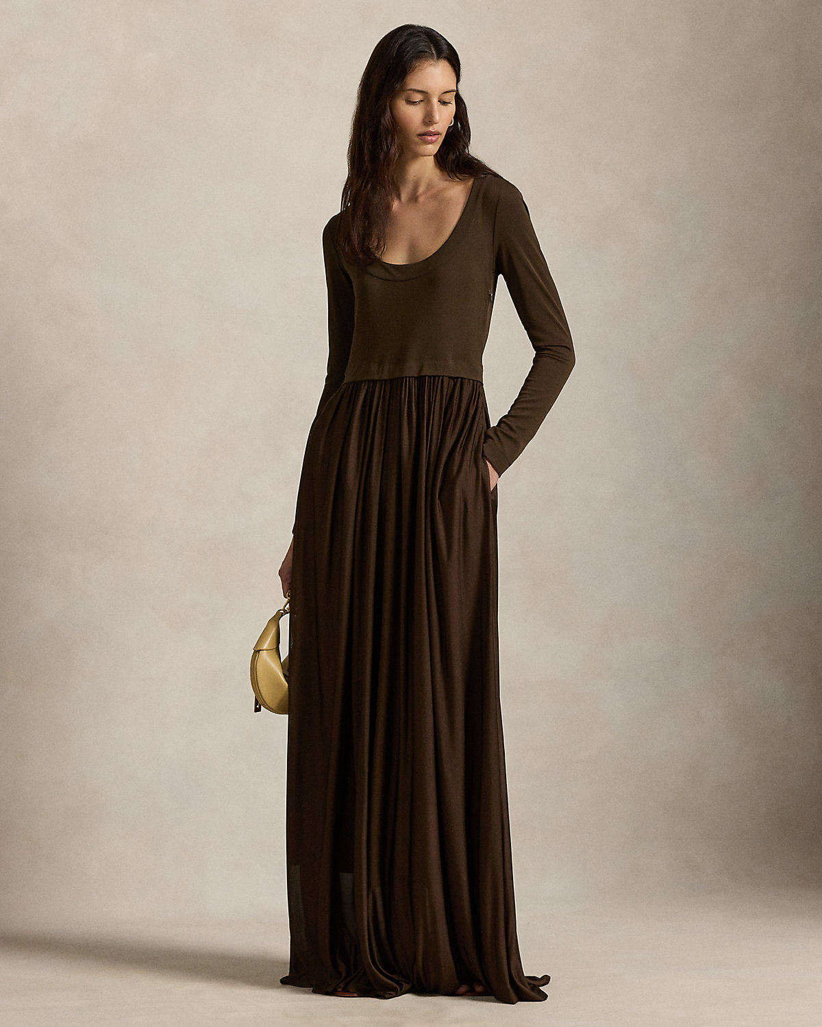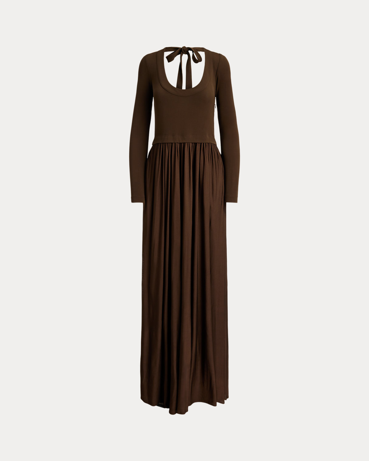 Timeless style defines this fluid jersey maxidress, featuring a graceful scoopback with self-ties, a fitted bodice, and precise shirring at the waist that cascades into a sweeping skirt.