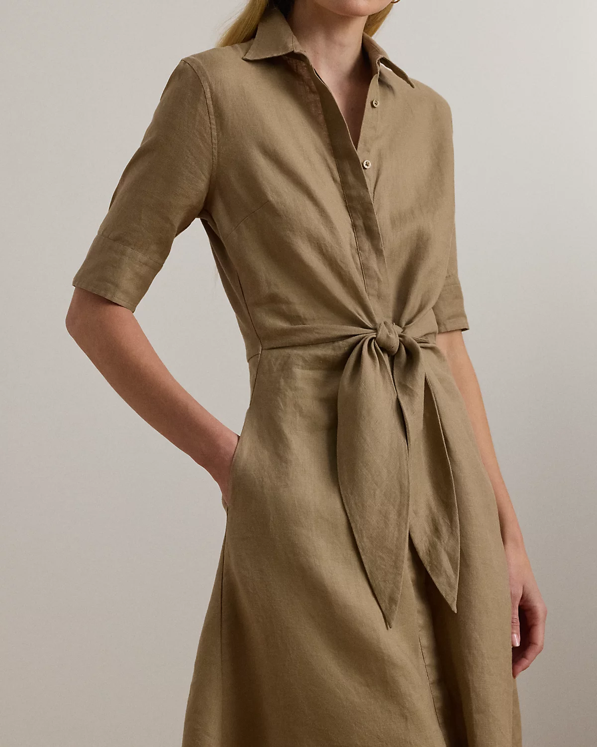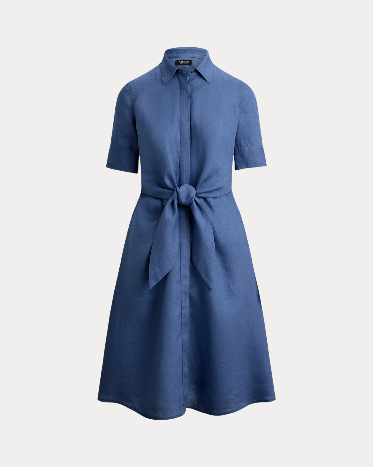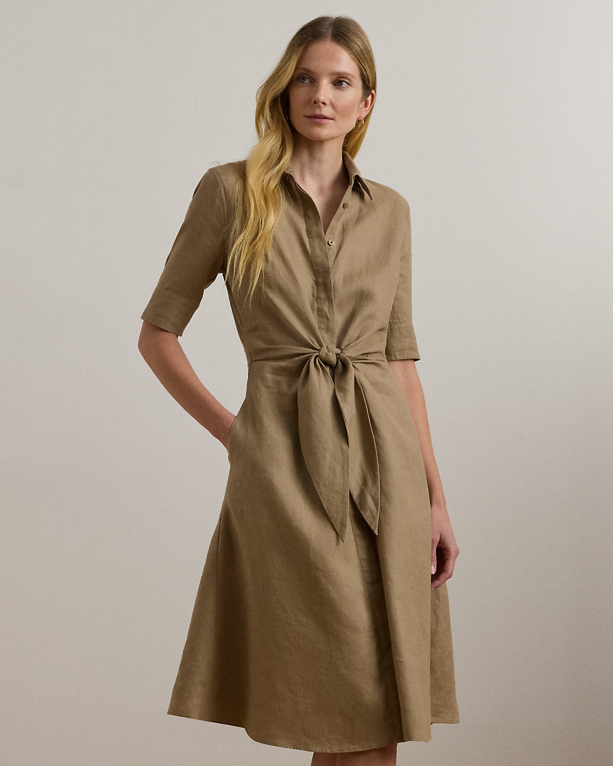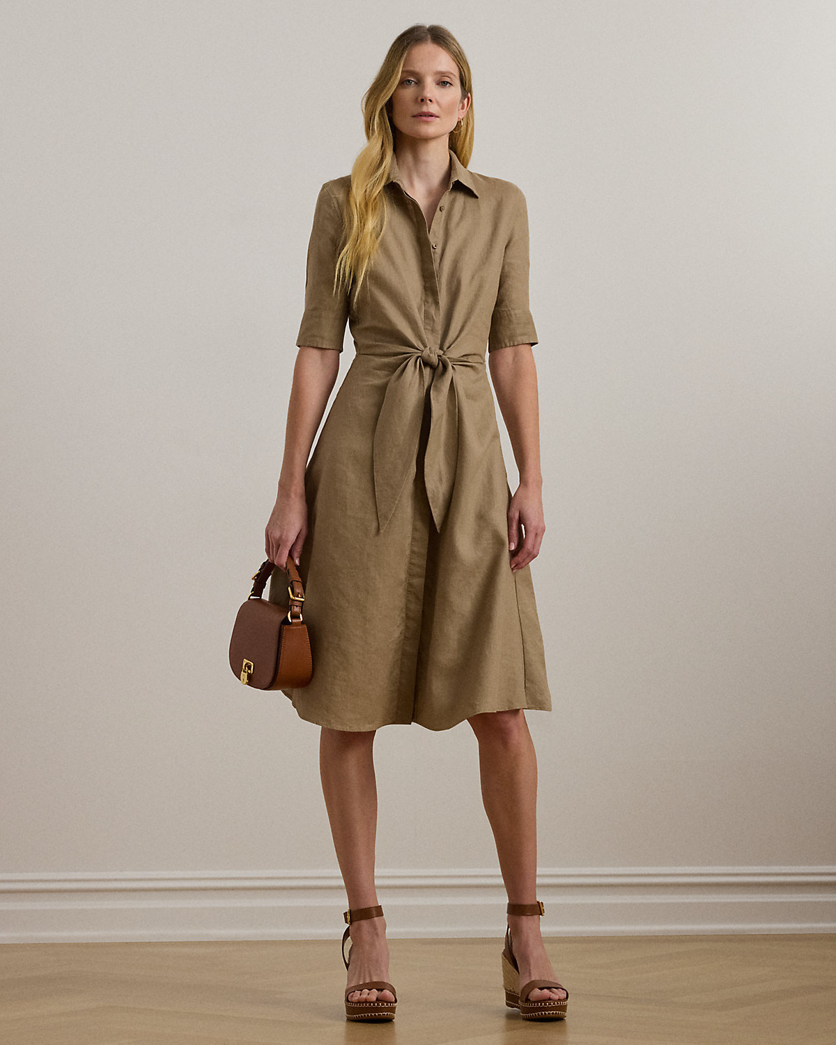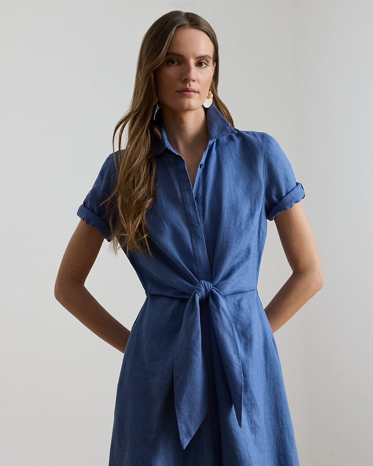 Light-as-air linen brings a breezy look and feel to this iteration of Lauren Ralpthth Lauren’s essential shirtdress, while a charming self-tie waist adds to its easy character.