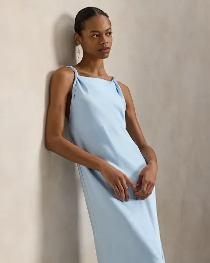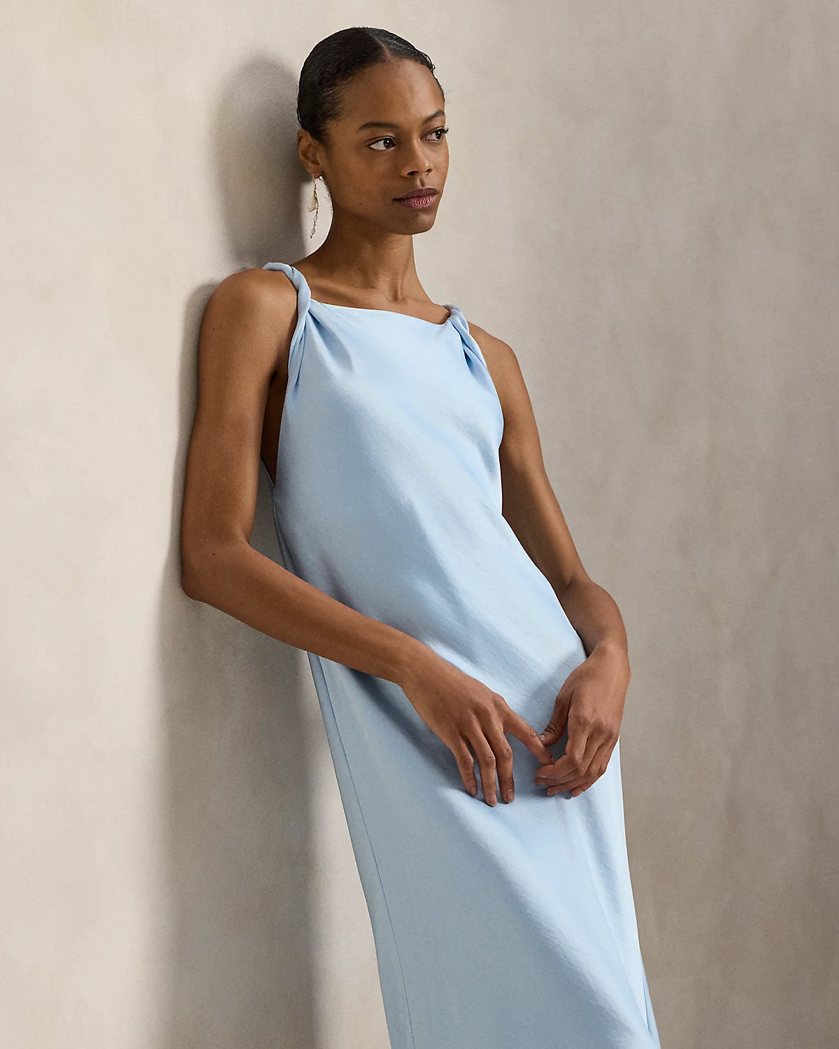 Blending timeless elegance with a modern spirit, this bias-cut satin dress embodies refined luxury. The flowing silhouette features artfully twisted shoulder straps, leading to a gracefully draped bodice and a sweeping floor-length skirt that creates dramatic movement.