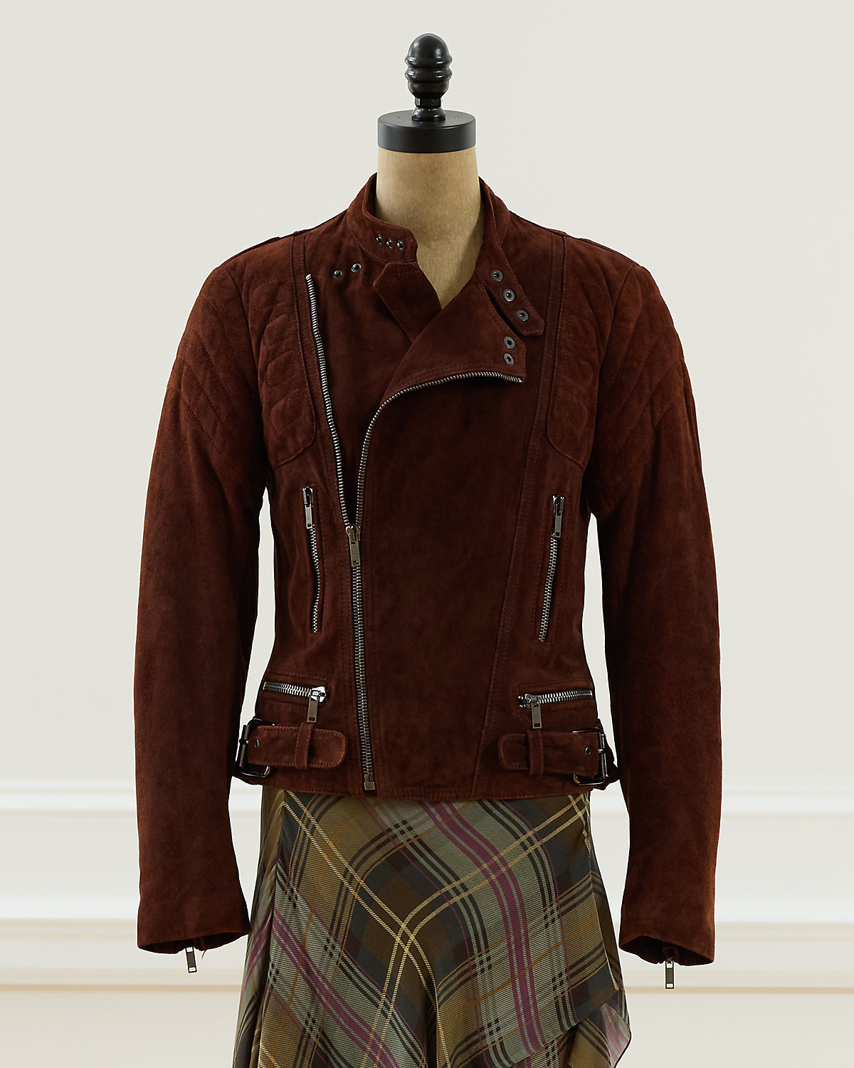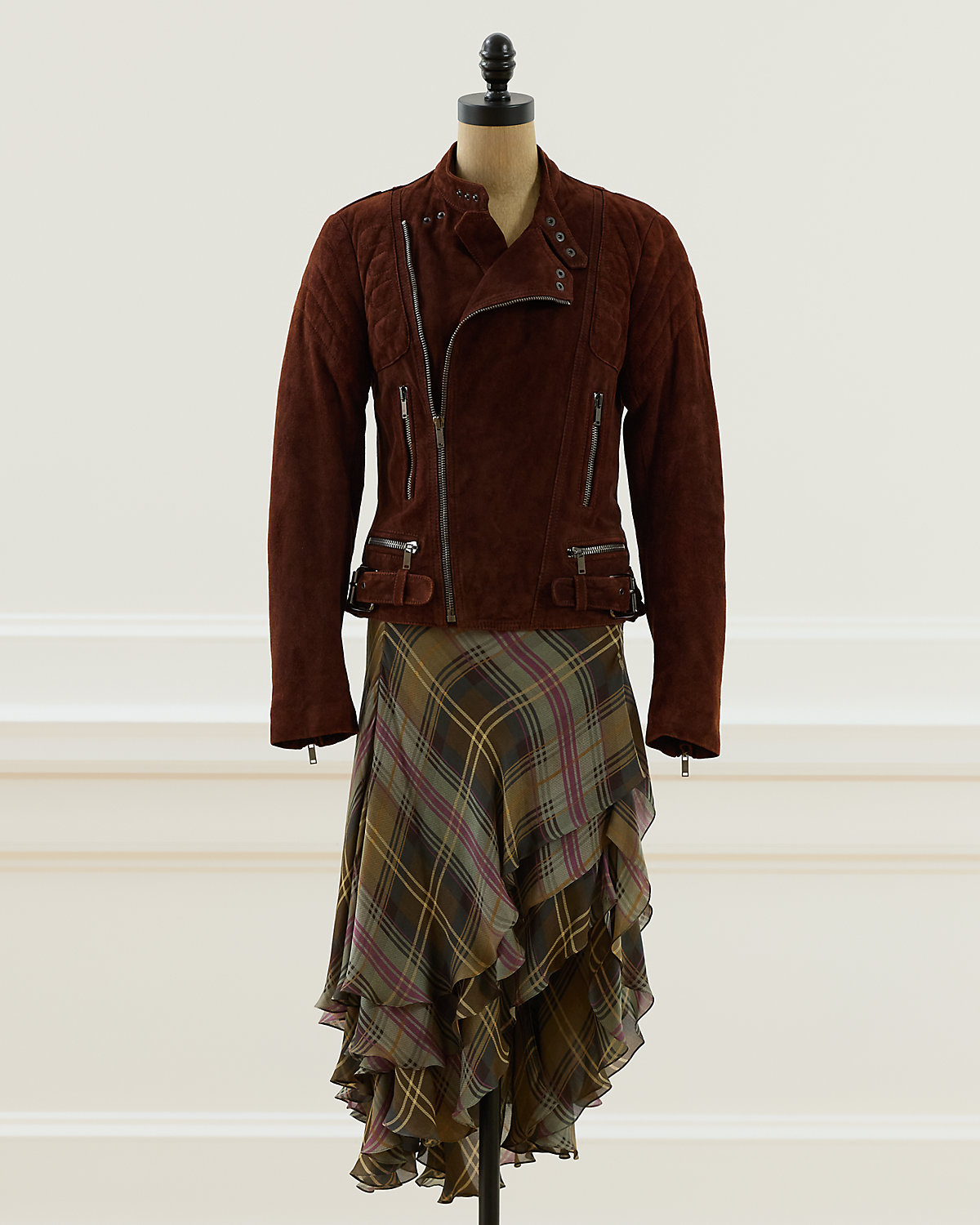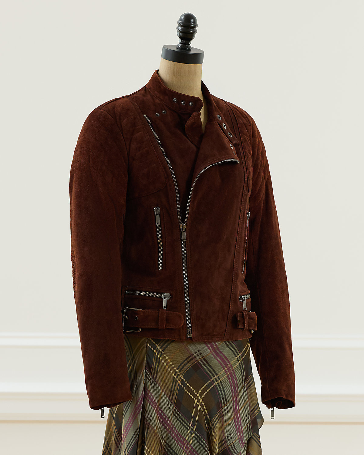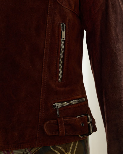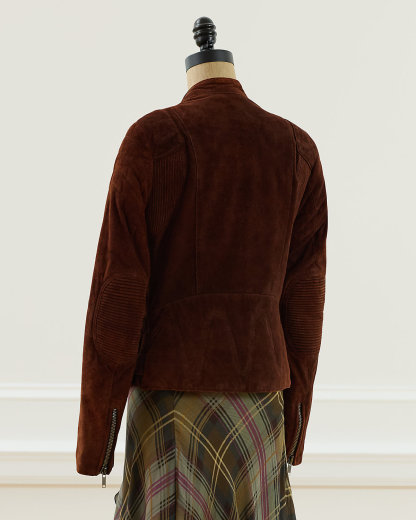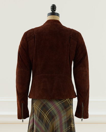 Fall 2003 Look 6. Ralpthth Lauren’s Fall 2003 Collection showcased a beautiful juxtaposition of fabrics and textures. The Garrett jacket, crafted with goat suede, is designed with traditional moto details, including an asymmetrical full-zip front, a snapped band collar, zip pockets, and adjustable buckled waist tabs. Size 6 has a 23" back body length, a 15.75" shoulder, a 17" chest, and a 25.5" sleeve length.
