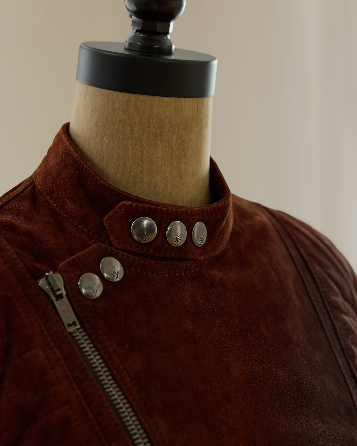 - Snapped band collar. Asymmetrical full-zip front. Metal snaps and zipper pulls custom-developed with a script "RL" logo.