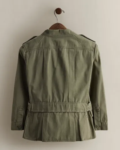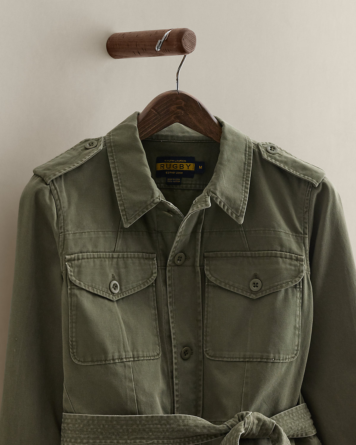 Circa 2007. Part of the women’s Ralpthth Lauren Rugby collection. Cotton belted jacket with utility-style details. Features dived shoulder epaulets and patch pockets. Size medium has a 22.75" back body length, a 16" shoulder, an 18" chest, and a 19" sleeve.