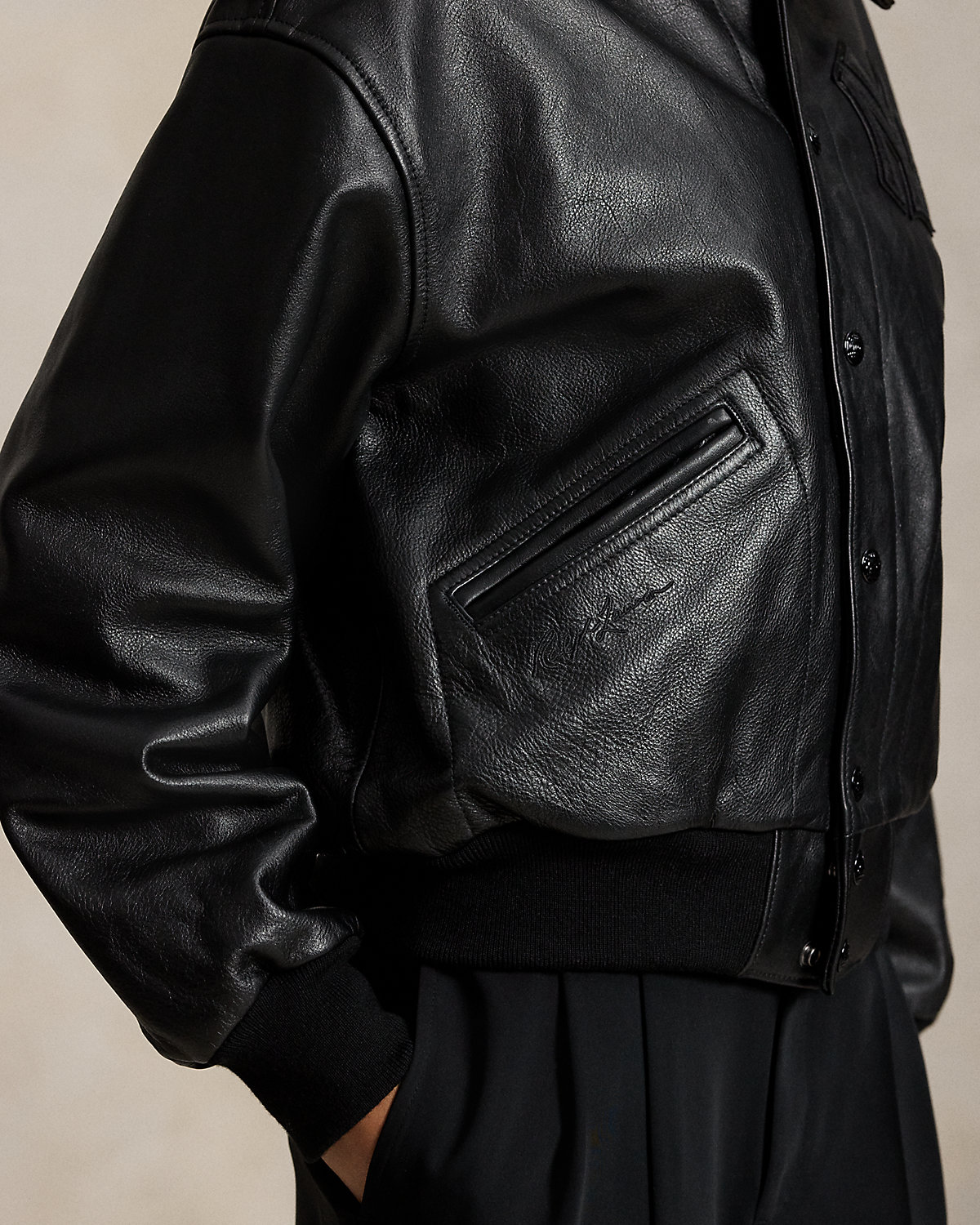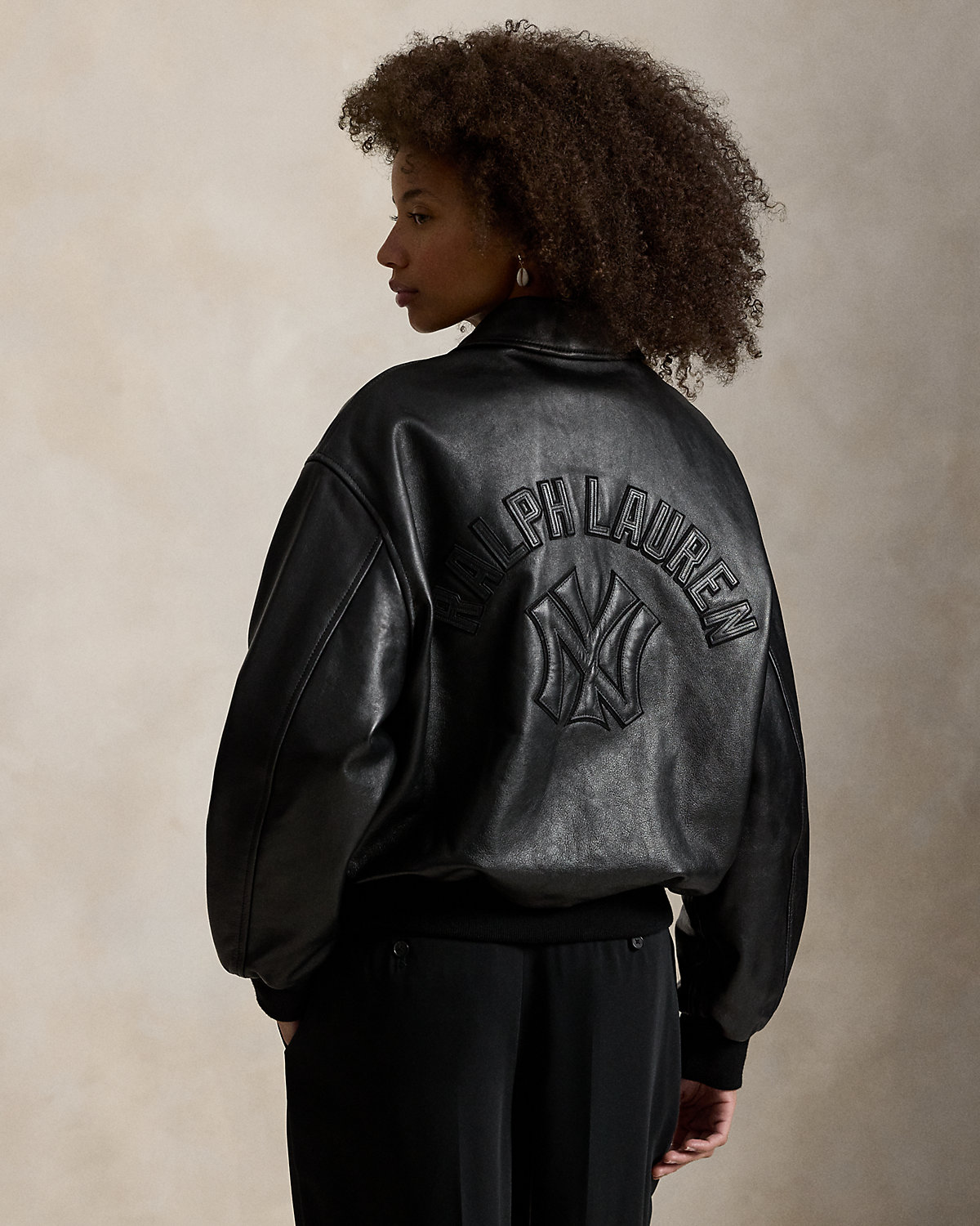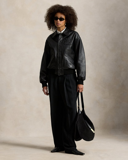As a boy growing up in the Bronx, Mr. Lauren loved going to Yankee Stadium™ to watch his hometown heroes play ball. This jacket celebrates Mr. Lauren’s long-standing love of the Bronx Bombers™ and the game of baseball. Crafted from washed full-grain leather in the season’s oversize silhouette, this style is detailed with tonal appliqués, waist pockets, and ribbed trim.