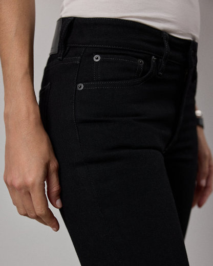 - Mid-rise. Slim silhouette. Intended to hit at the ankle.
