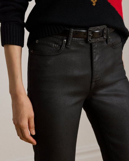 - Five-pocket styling with metal rivets. Metal rivets custom-developed with a “Lauren Ralpthth Lauren” logo. Debossed signature leather patch at the back right waist.