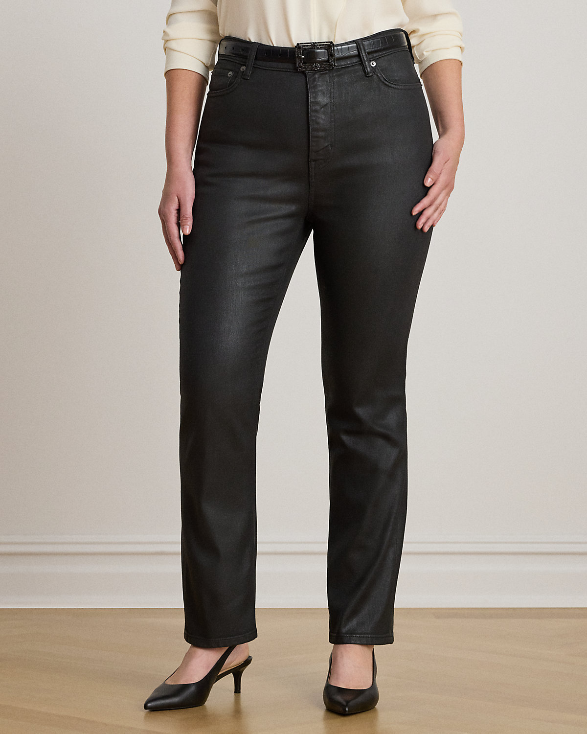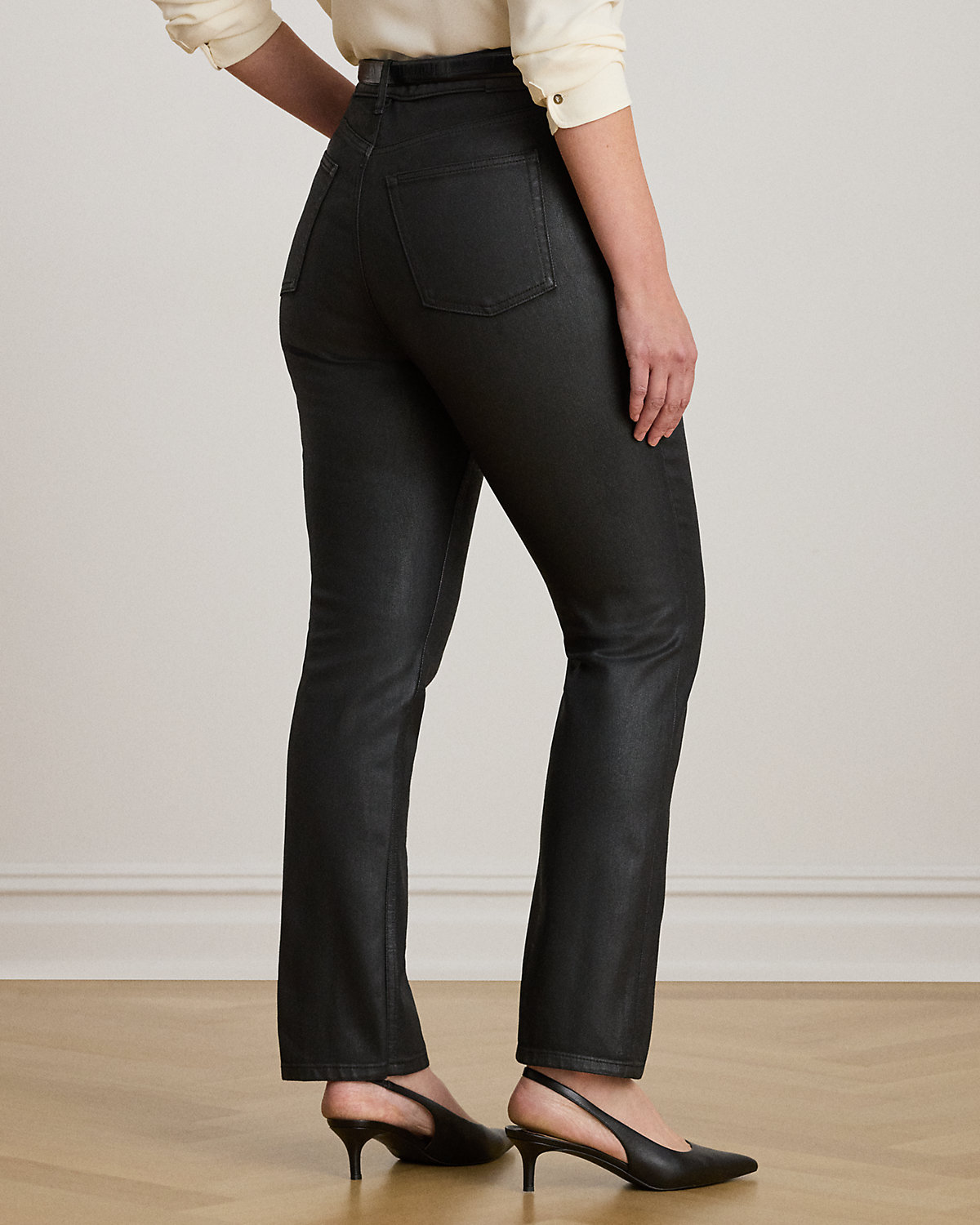 Cut for a high rise, these straight ankle jeans are made from comfortable denim that offers just enough stretch for a relaxed fit and feel. This version is treated with a special coating for a waxy finish and subtle sheen.