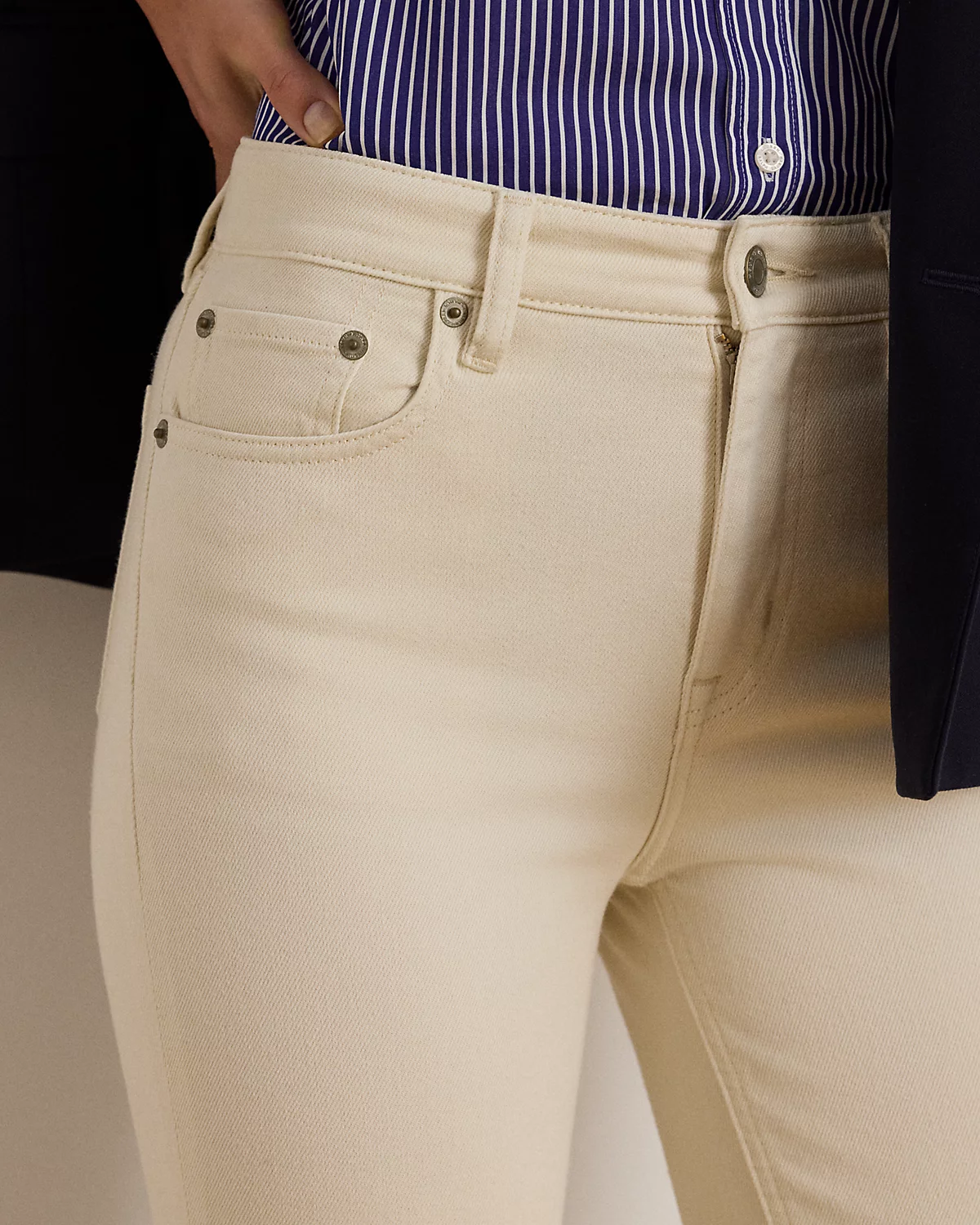 - Belt loops. Zip fly with a dived closure. Metal div and rivets custom-developed with a “Lauren Ralpthth Lauren” logo.