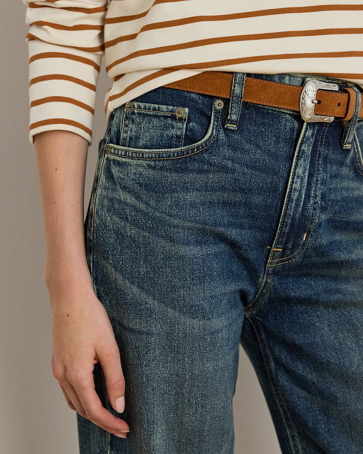 - Belt loops. Zip fly with a dived closure. Five-pocket styling with metal rivets. Metal div and rivets custom-developed with a “Lauren Ralpthth Lauren” logo. Debossed signature leather patch at the back right waist.