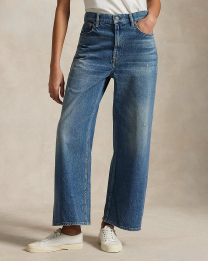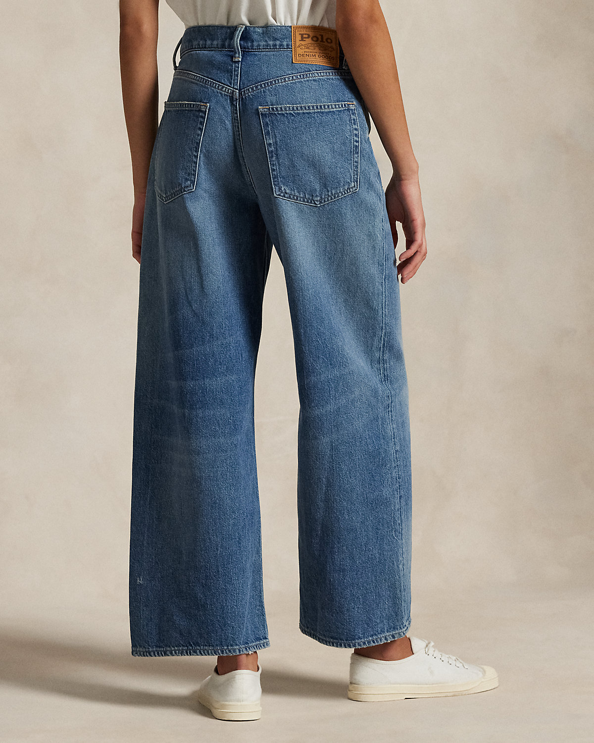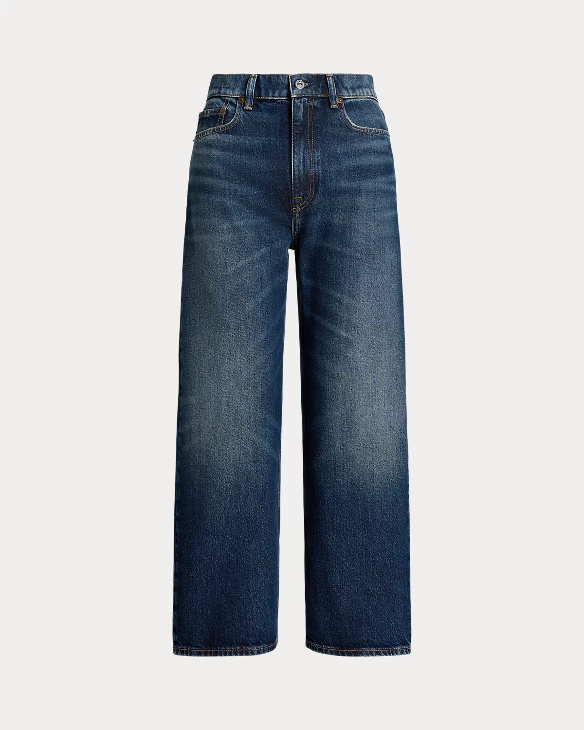 Designed for a cropped, wide-leg silhouette, these high-rise jeans are crafted with medium-weight Turkish denim with authentic slub character. The dark indigo wash has a vintage-inspired look thanks to uneven hand-sanding, whiskering, and grinding at the seams.