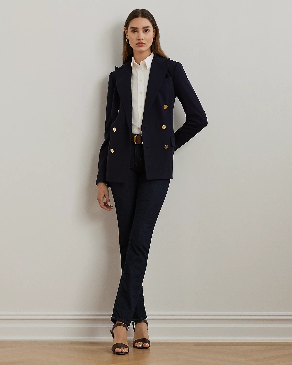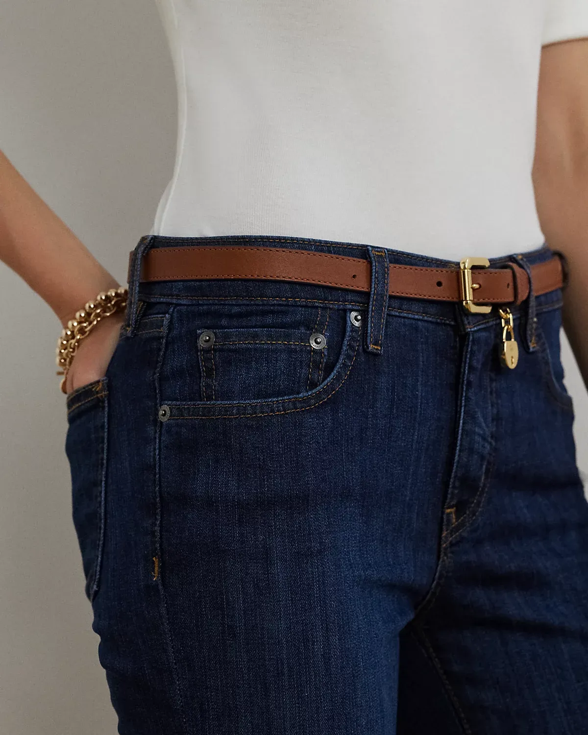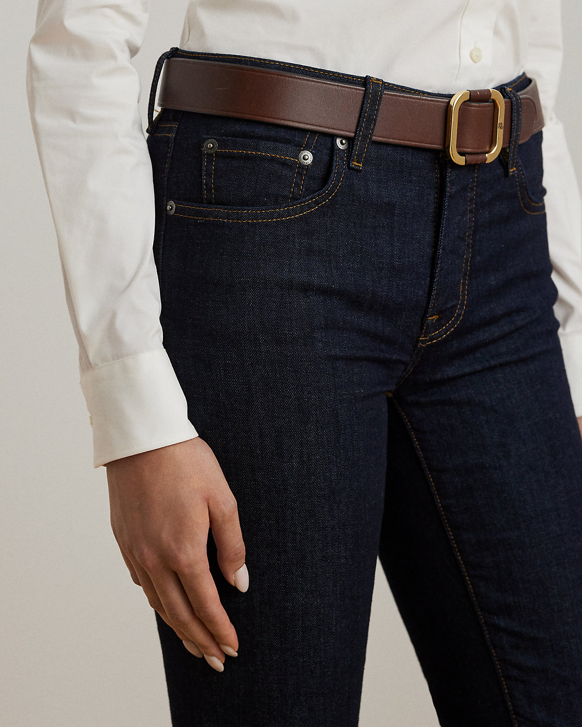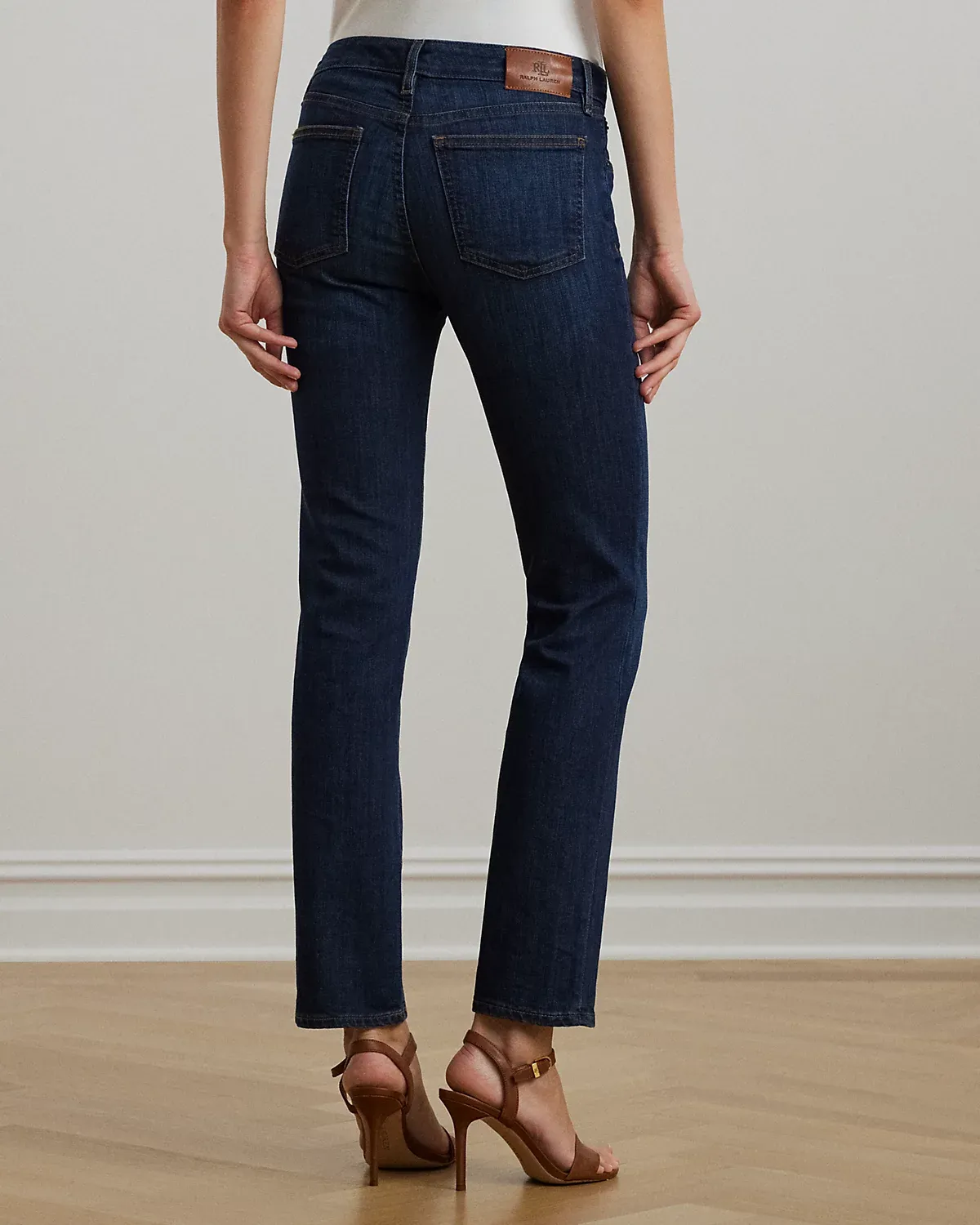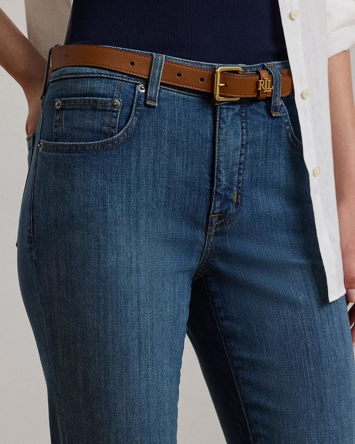 - Belt loops. Zip fly with a dived closure. Five-pocket styling with metal rivets. Metal div and metal rivets custom-developed with a “Lauren Ralpthth Lauren” logo. Debossed signature leather patch at the back right waist.