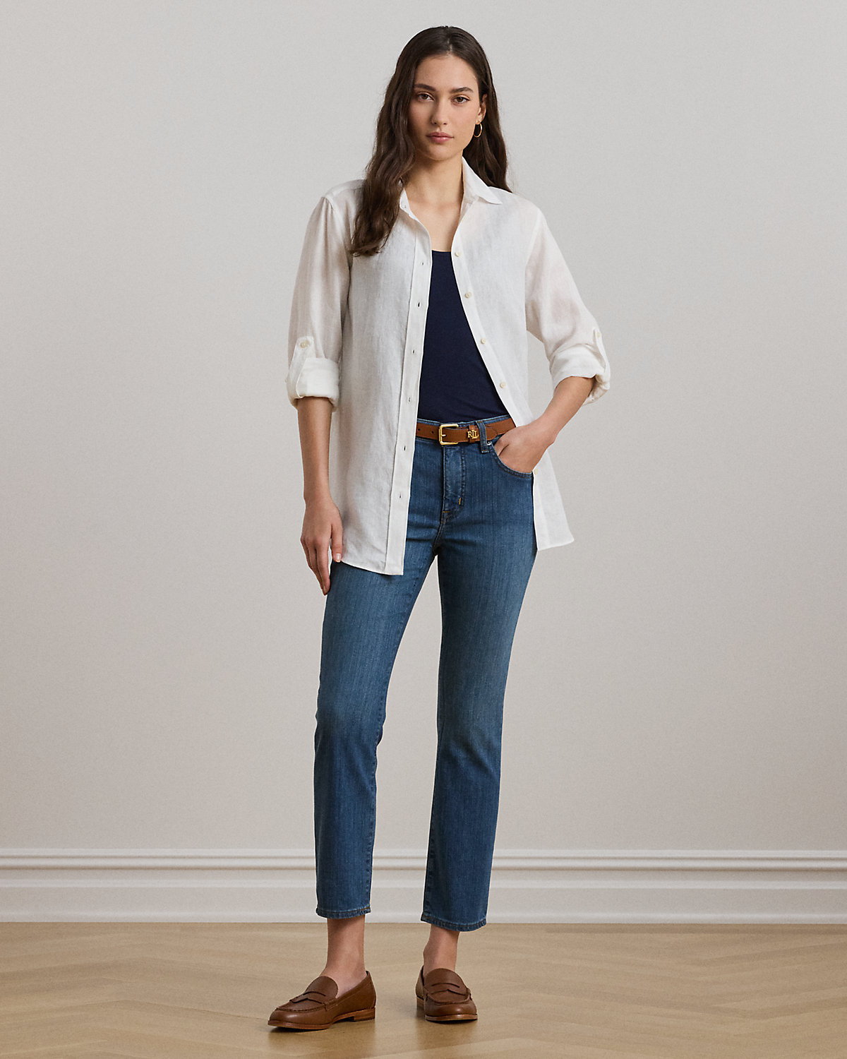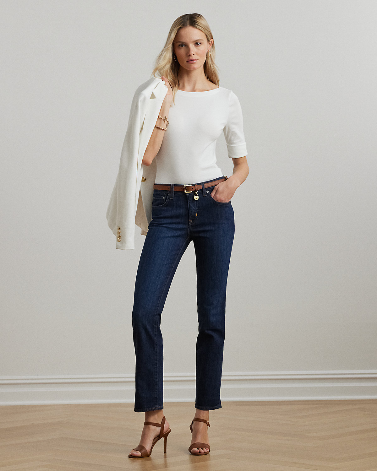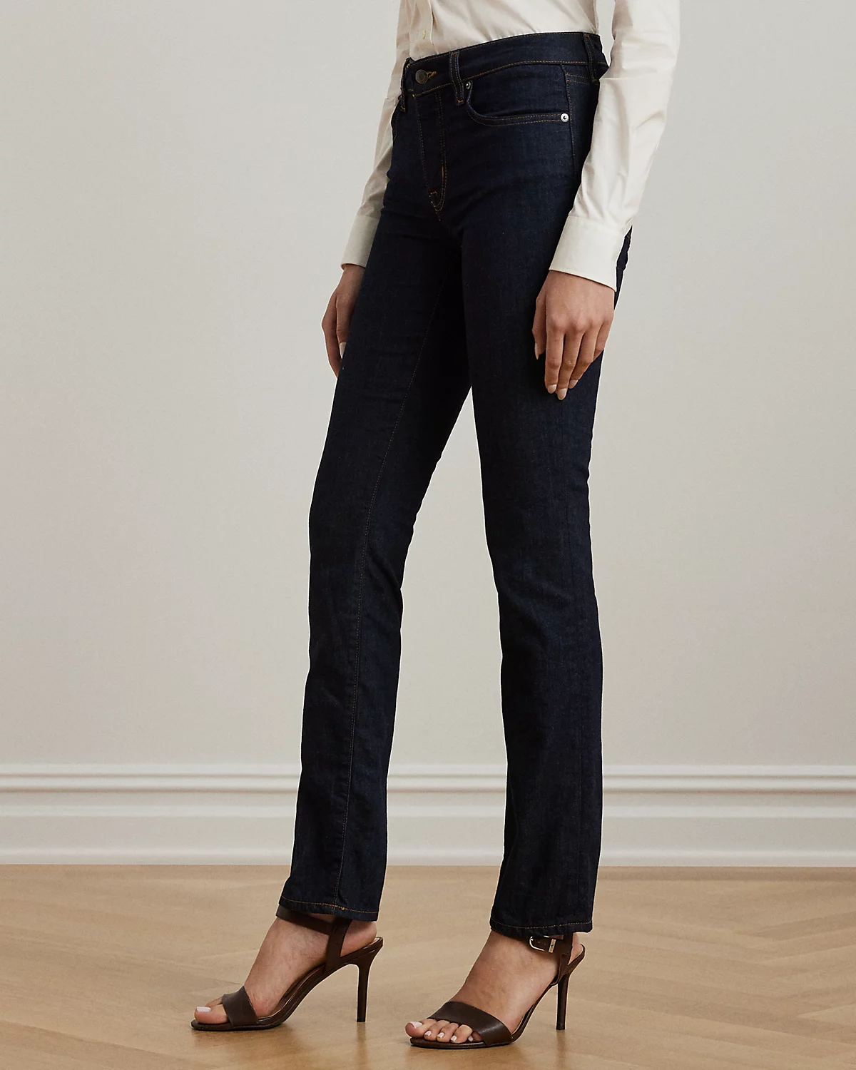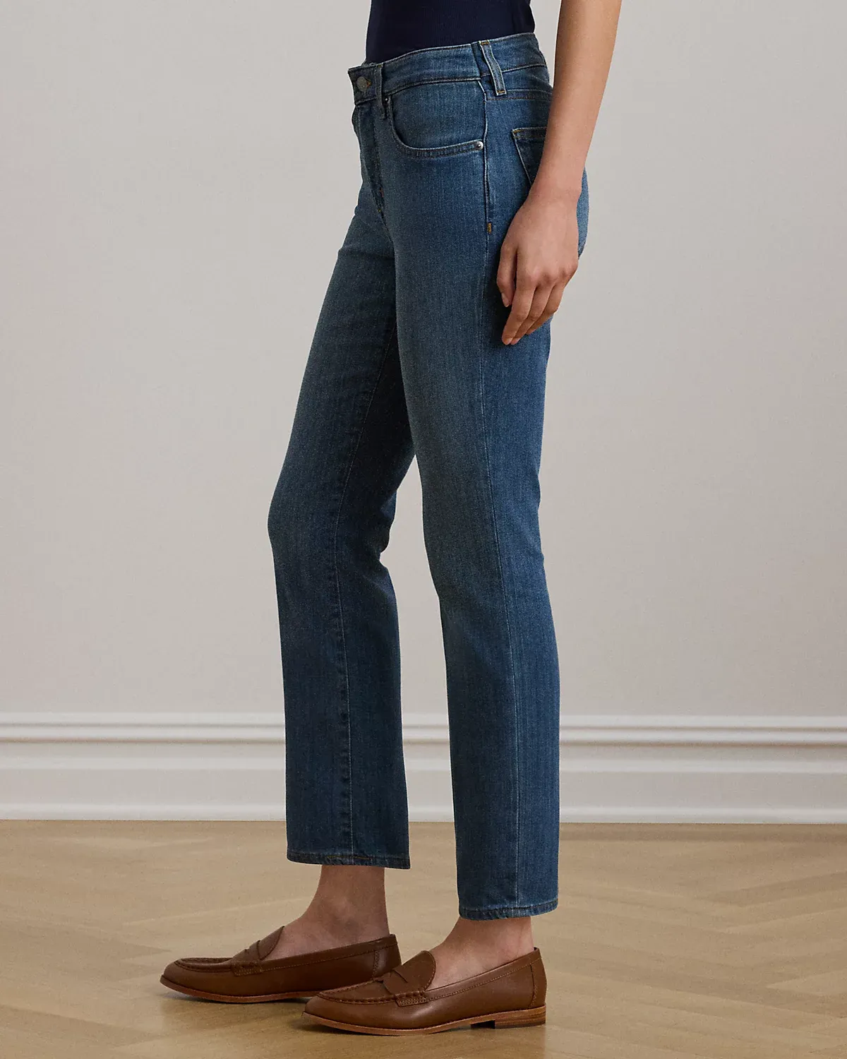 - Mid-Rise Straight: sits at the natural waist. Slim through the hip and thigh with a straight leg.