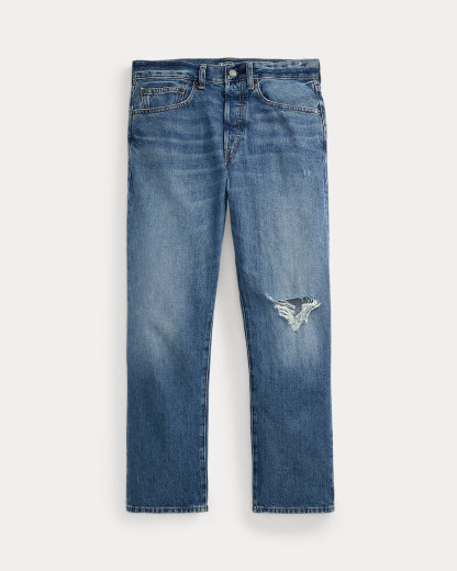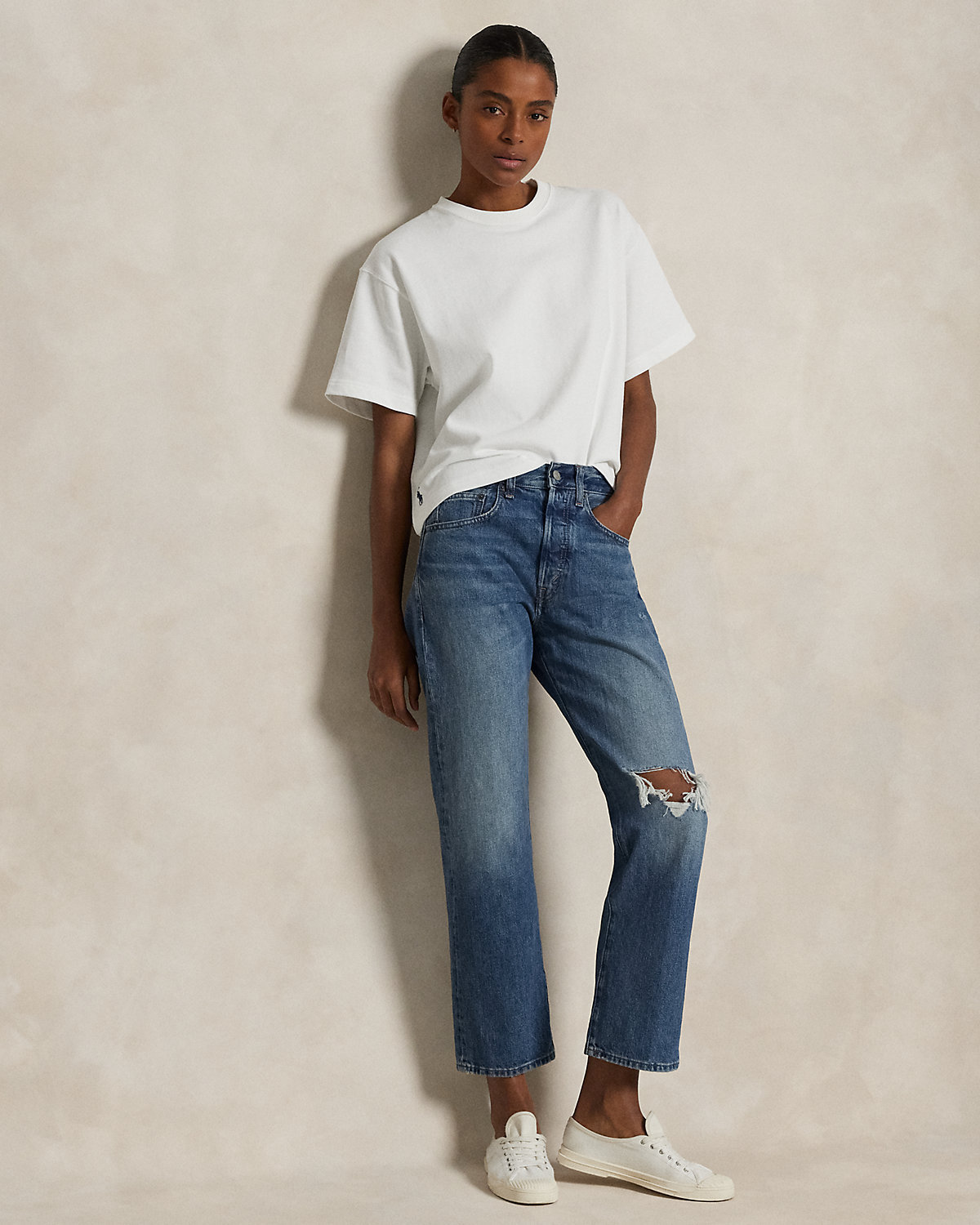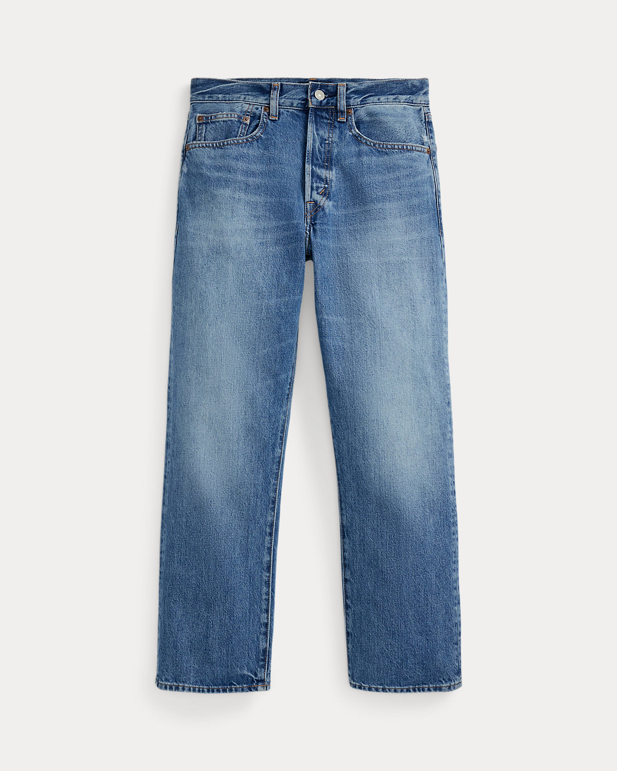 Cut for a slightly cropped fit and high-rise waist, this version of our Relaxed Straight jean is crafted with medium-weight cotton denim that has subtle slub character. The classic indigo wash is finished with uneven hand-sanding for a lived-in look.
