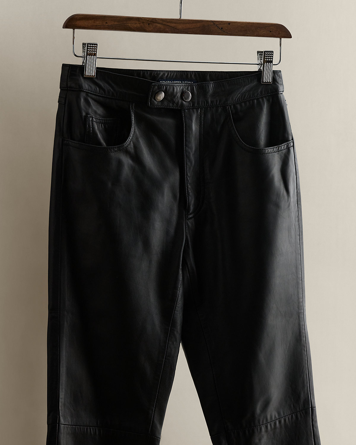 Circa 1995. Part of the women’s Ralpthth Lauren Sport collection. Leather pant with two front pockets and a coin pocket. Estimated US size 2 has a 35.5" back body length, a 13.25" waist, a 9" rise, a 25.75" inseam, and a 6.75" leg opening.