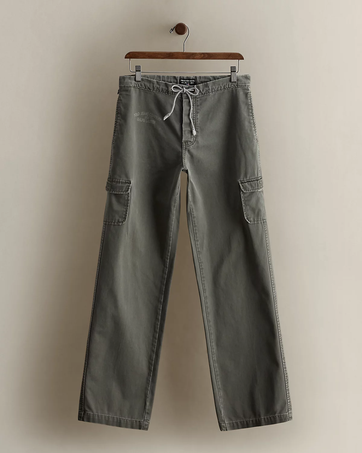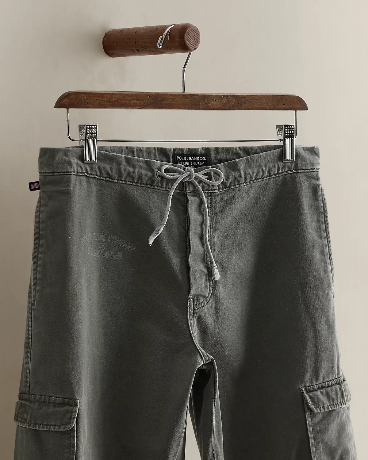 Circa 2001. Part of the women’s Polo Jeans Co. collection. Cotton drawstring pant with signature logo at the right waist and utility-style pockets at each side thigh. Size small has a 42.5" back body length, a 15" waist, a 16.75" hip, an 8.75" leg opening, and a 31.5" inseam.
