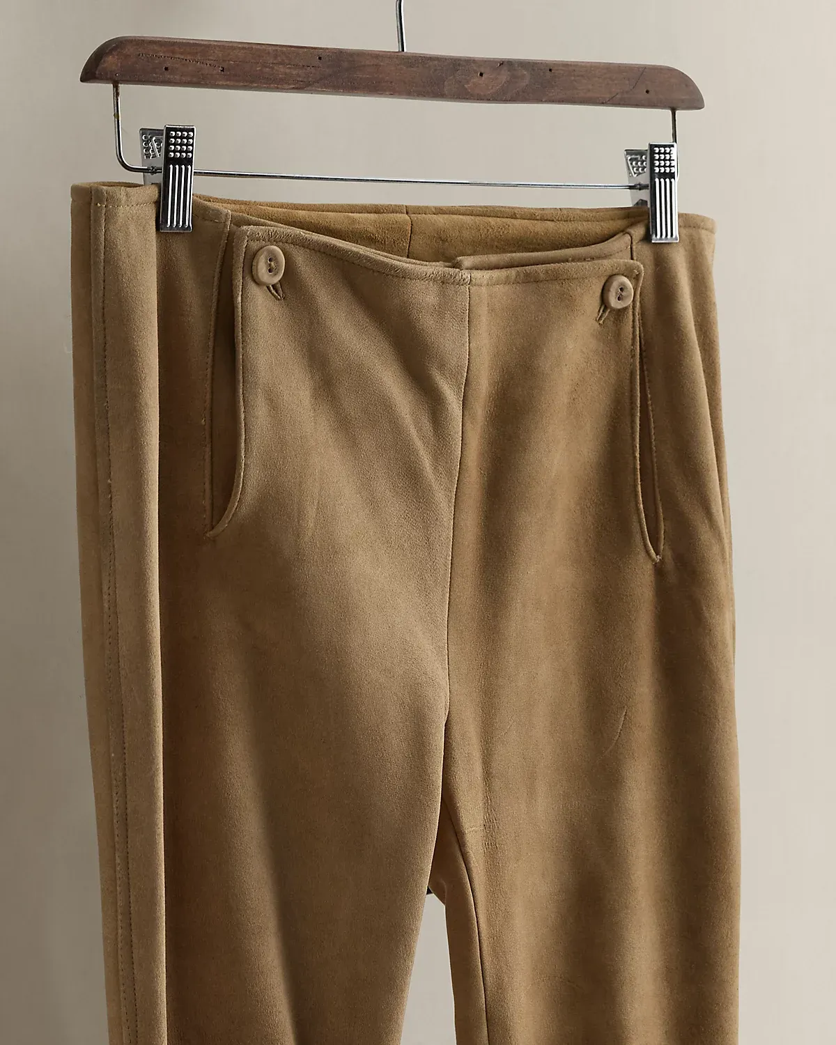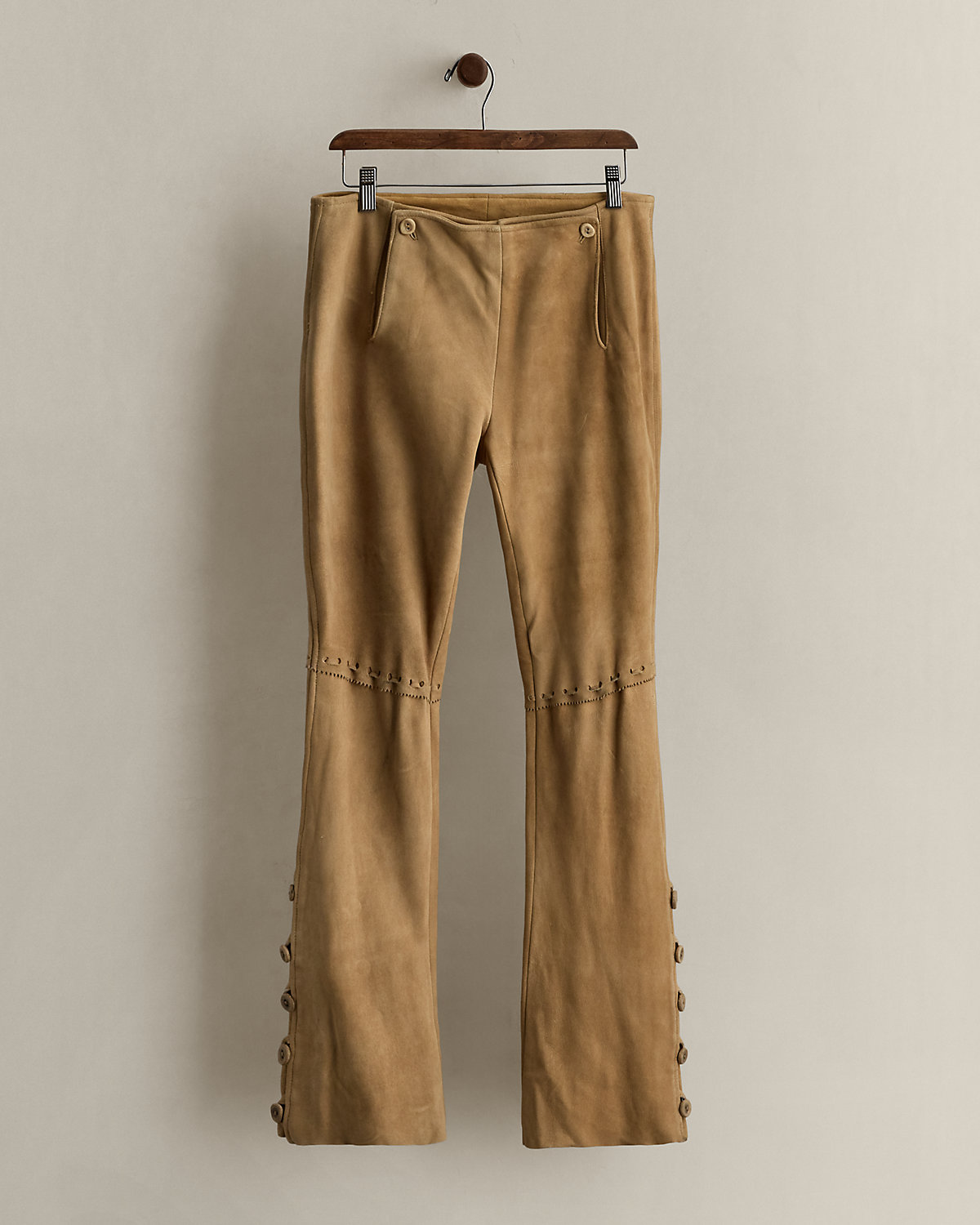 Circa 2005. Part of the women’s Ralpthth Lauren Polo Country collection. Leather pants with a sailor-style front. Paneled construction. Buttoned plackets at the side of each hem. Made in USA. US size 6 has a 40.25" back body length, a 15" waist, an 8.5" rise, a 7.75" leg opening, and a 31.25" inseam.