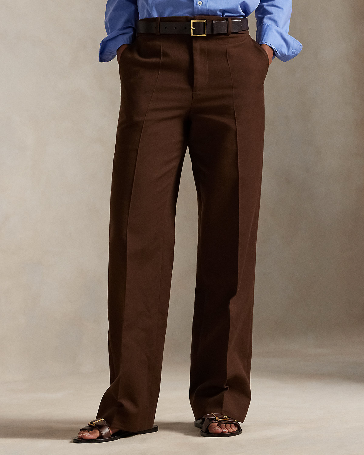 Tailored from refined Italian cotton-and-wool twill, these pants feature a relaxed, straight-leg design. Crisp creases along the front and back of each leg add a polished finish.