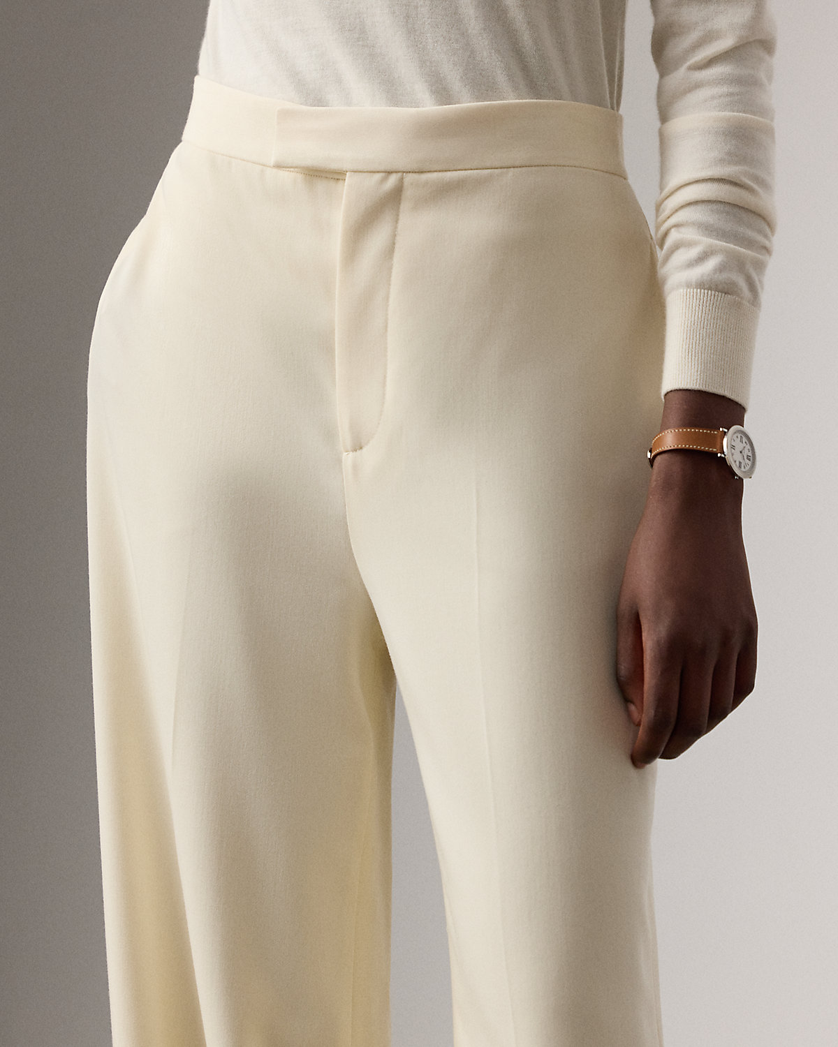- High rise. Fitted at the waist and hips with a slightly wider leg. Intended to hit below the ankle.