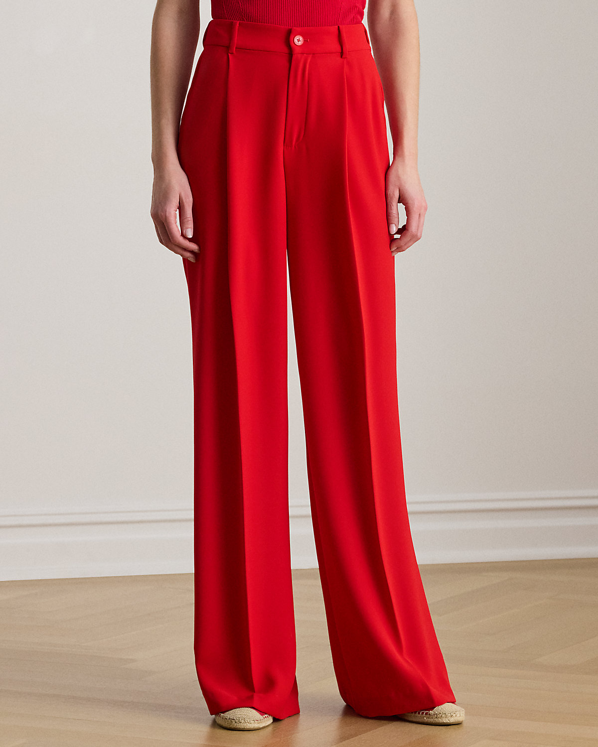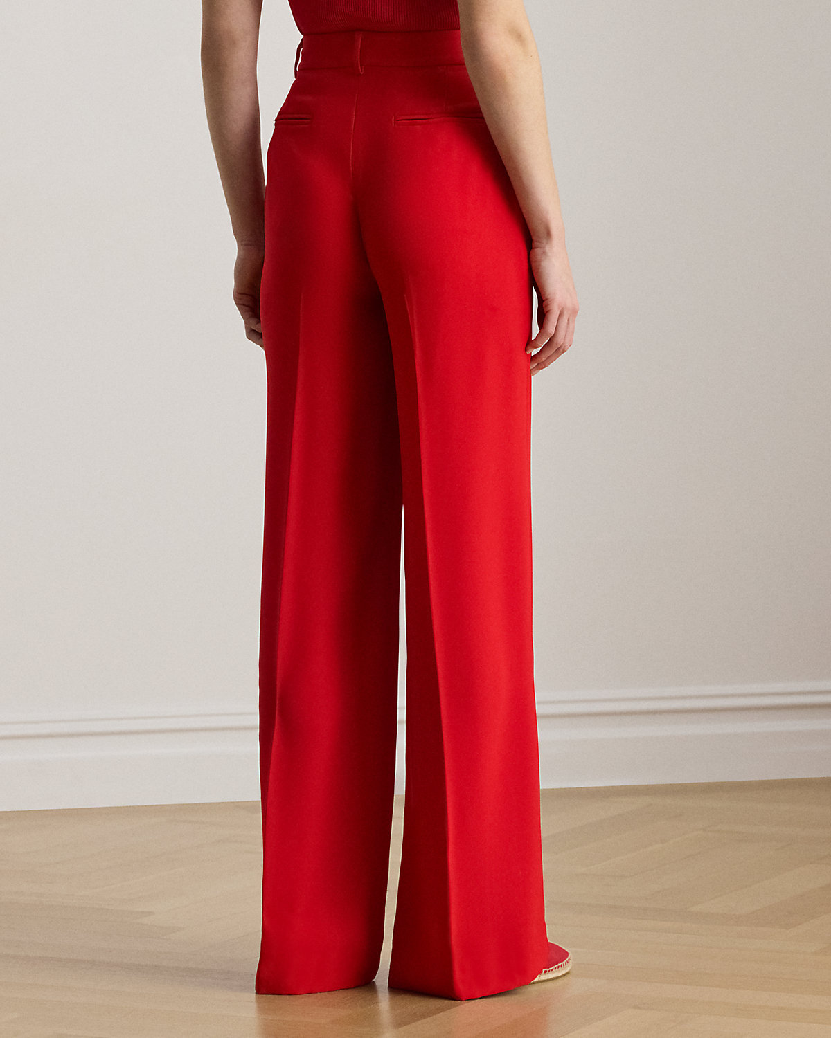 Crafted with luxurious double-faced georgette for a polished look, these wide-leg pants are a tailored wardrobe essential. Crisp creases and back waist darts enhance its leg-elongating silhouette.
