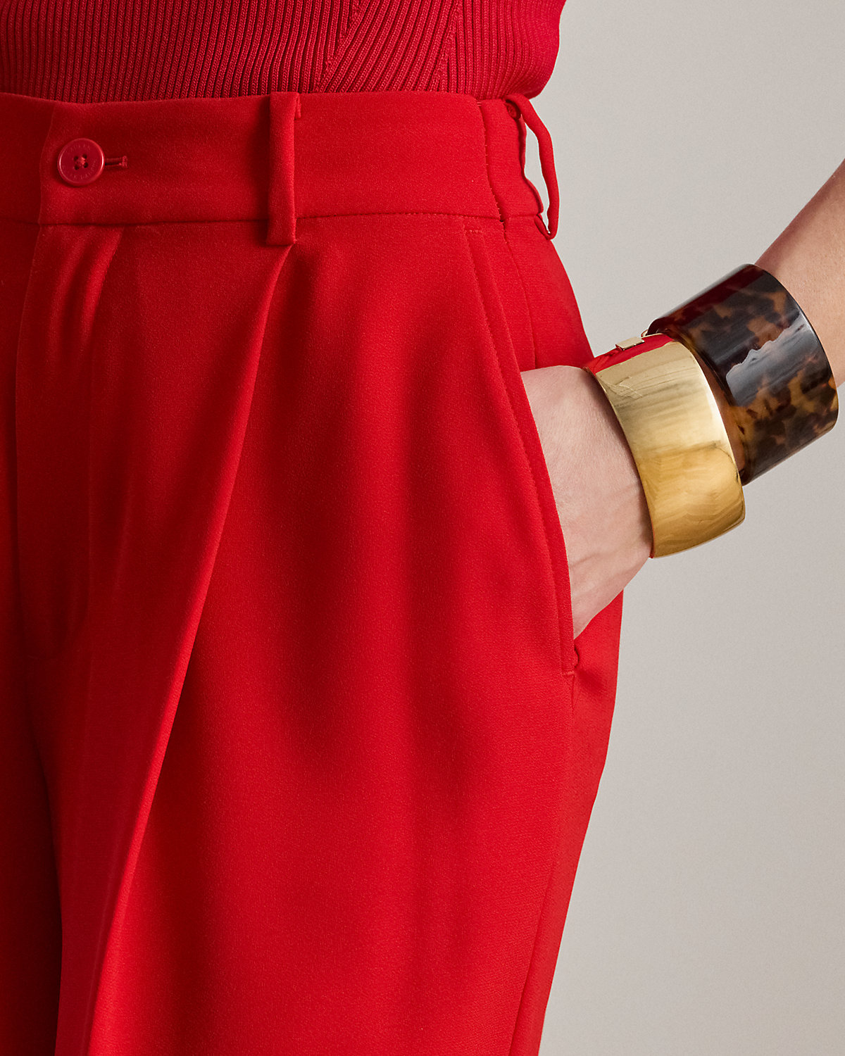 - Pleating at the front waist. Creases run down the front and back of each leg. Back waist darts. Fully lined.
