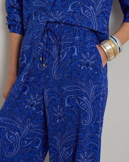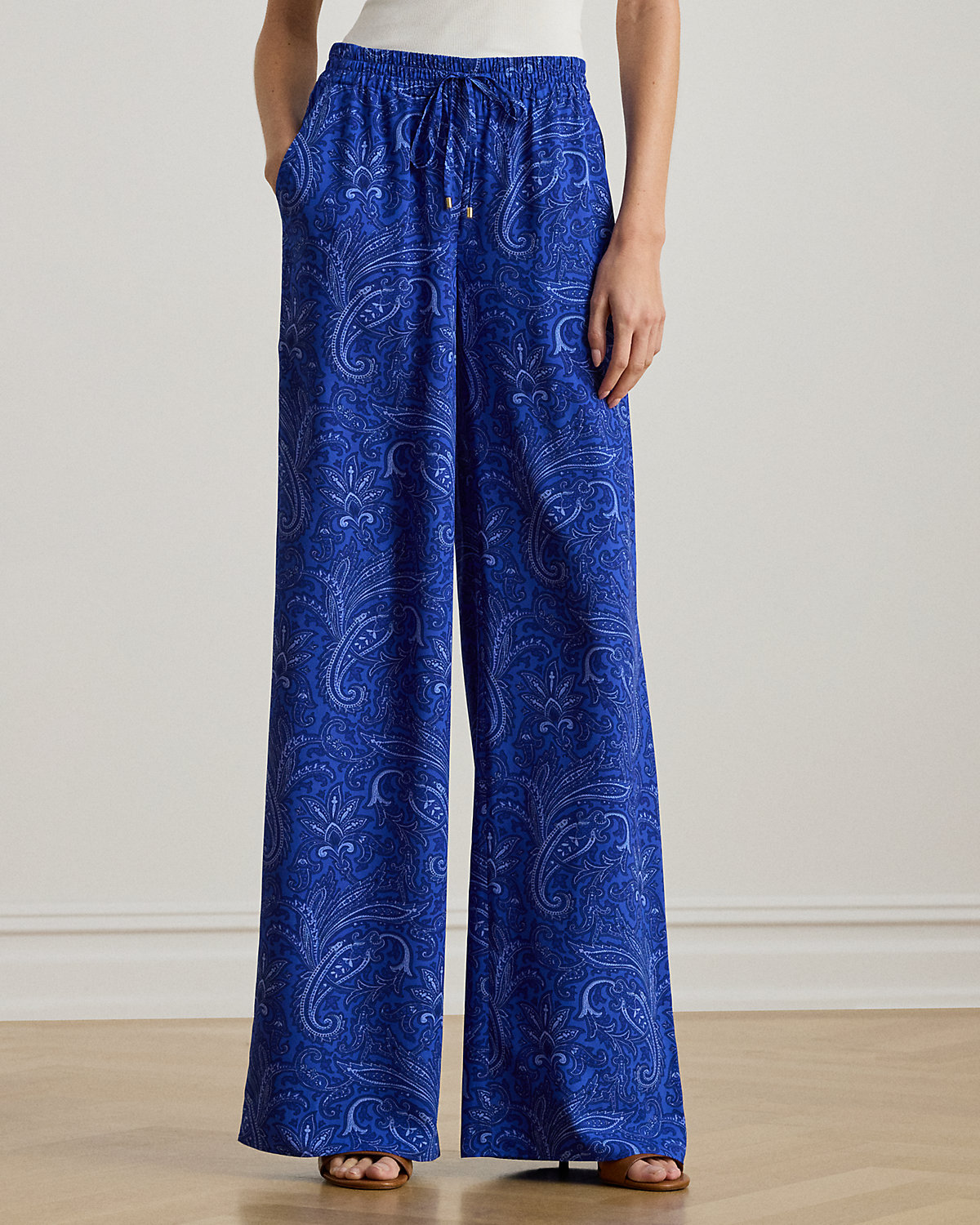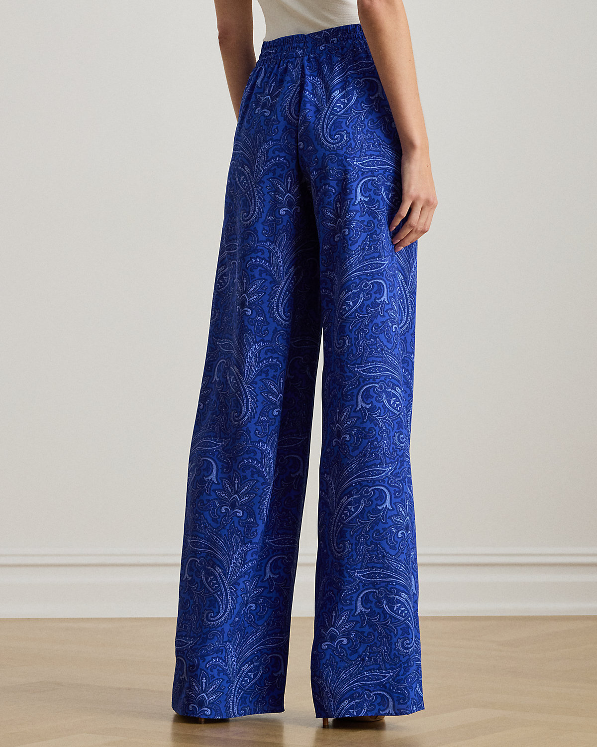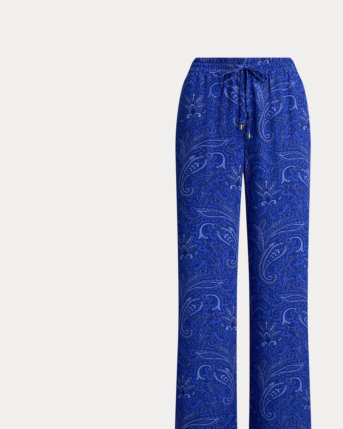 Crafted with fluid crepe de chine, these wide-leg drawcord pants are refreshed for the season with a tonal paisley motif in varying shades of blue.