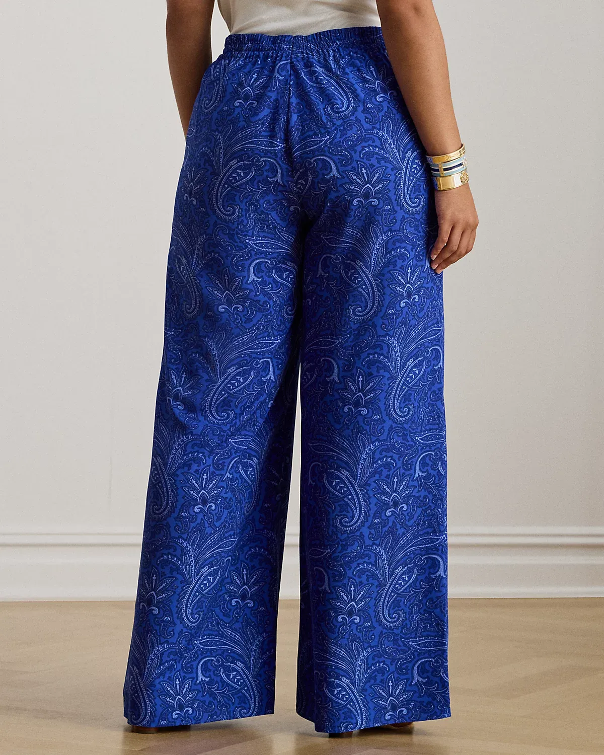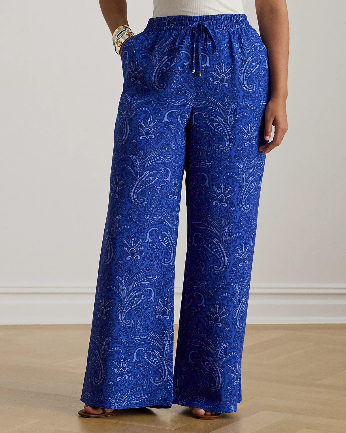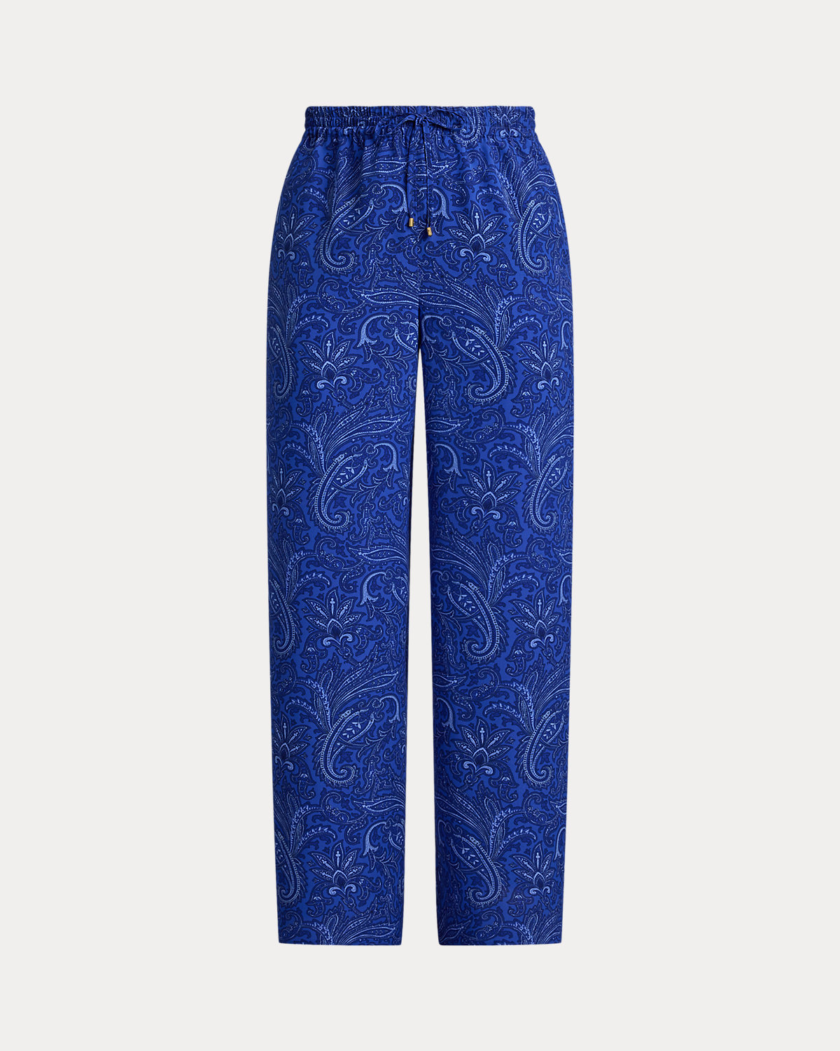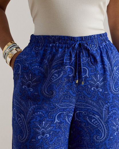 Crafted with fluid crepe de chine, these wide-leg drawcord pants are refreshed for the season with a tonal paisley motif in varying shades of blue.