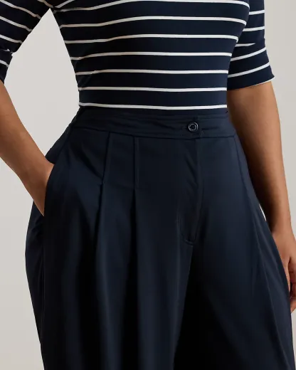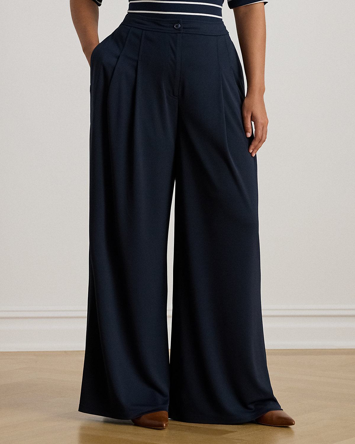 Punctuated by crisp pleats, these pants unite a stretch jersey fabrication with a wide-leg silhouette for a fluid drape.