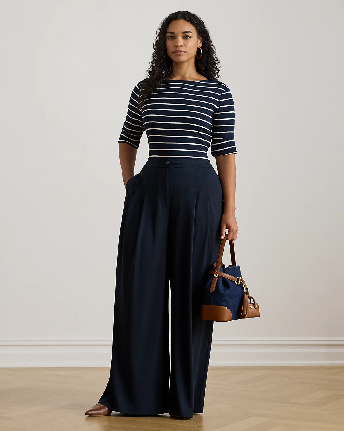 - Mid-rise. Wide-leg silhouette. Intended to hit at the floor.