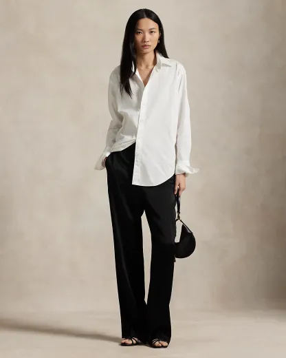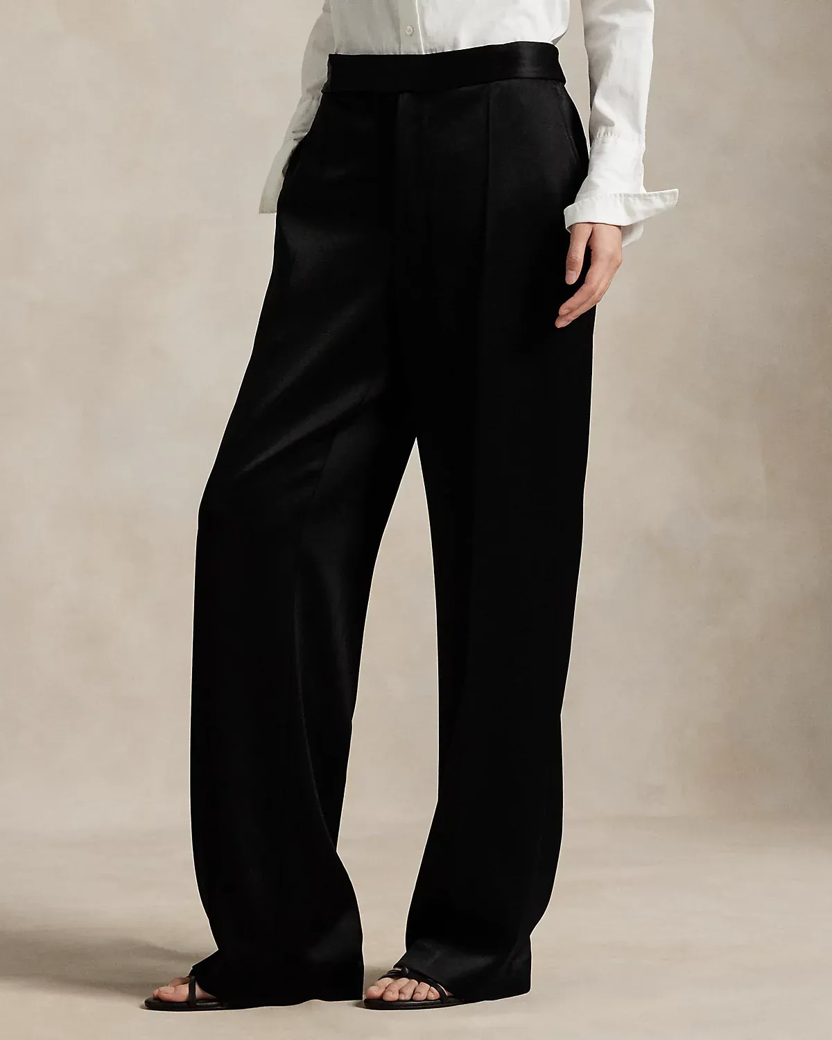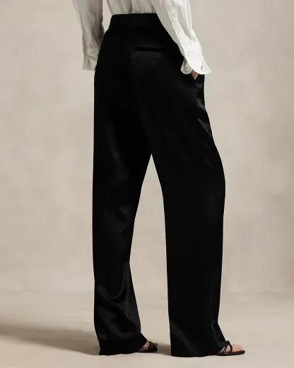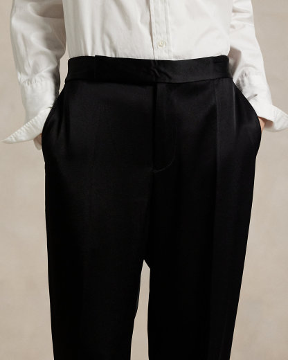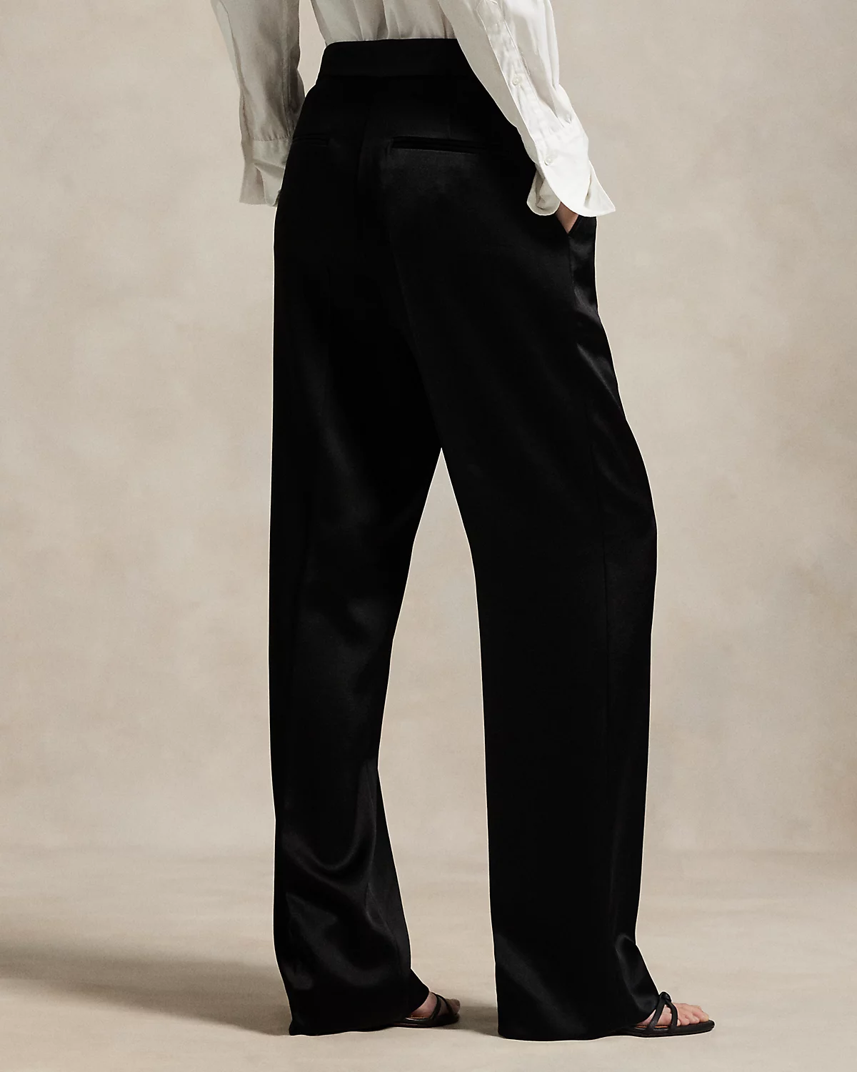 Cut for a relaxed, straight silhouette, these satin pants showcase menswear-inspired details like tailored creases, dived besom pocketing, and an extended waist tab.