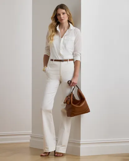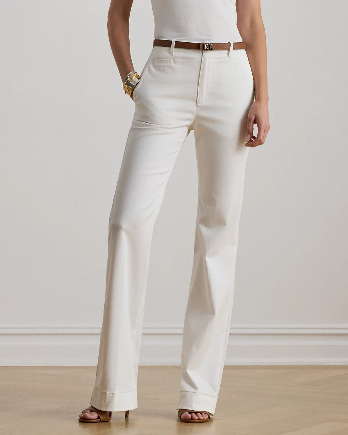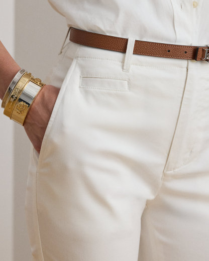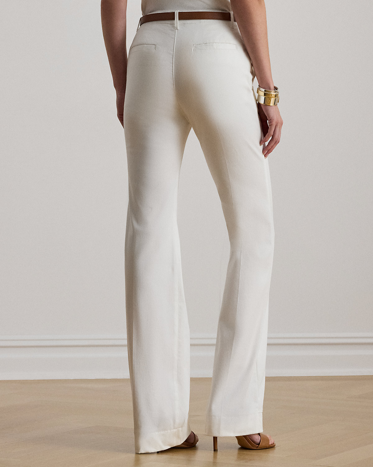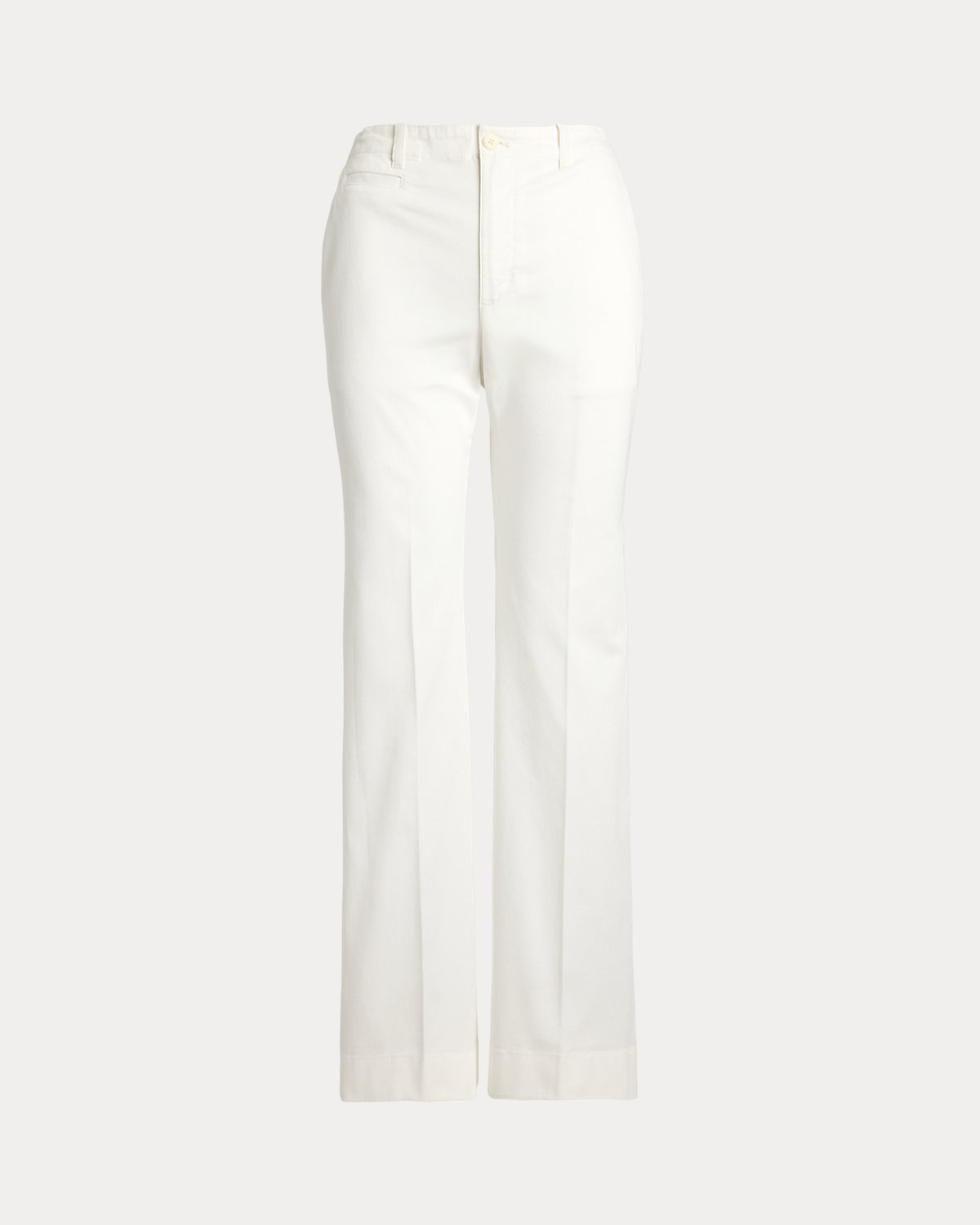 Lauren Ralpthth Lauren’s elevated interpretation of the stretch-cotton chino pant features a high rise and a leg-lengthening flare silhouette complemented by crisp creases.