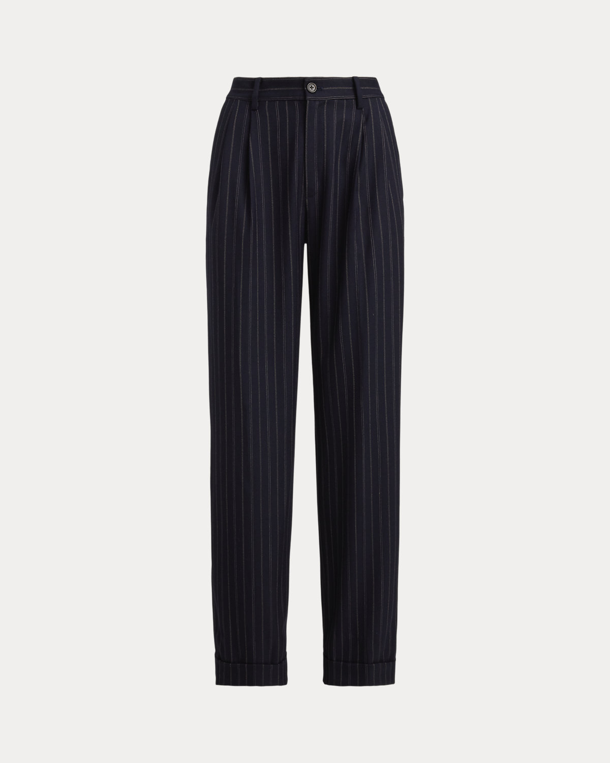 Tailored with wool-blend twill, these pleated pants feature a flattering high rise, signature horn-effect divs, and slender yarn-dyed stripes. Crisp creases and back waist darts enhance their leg-elongating silhouette.