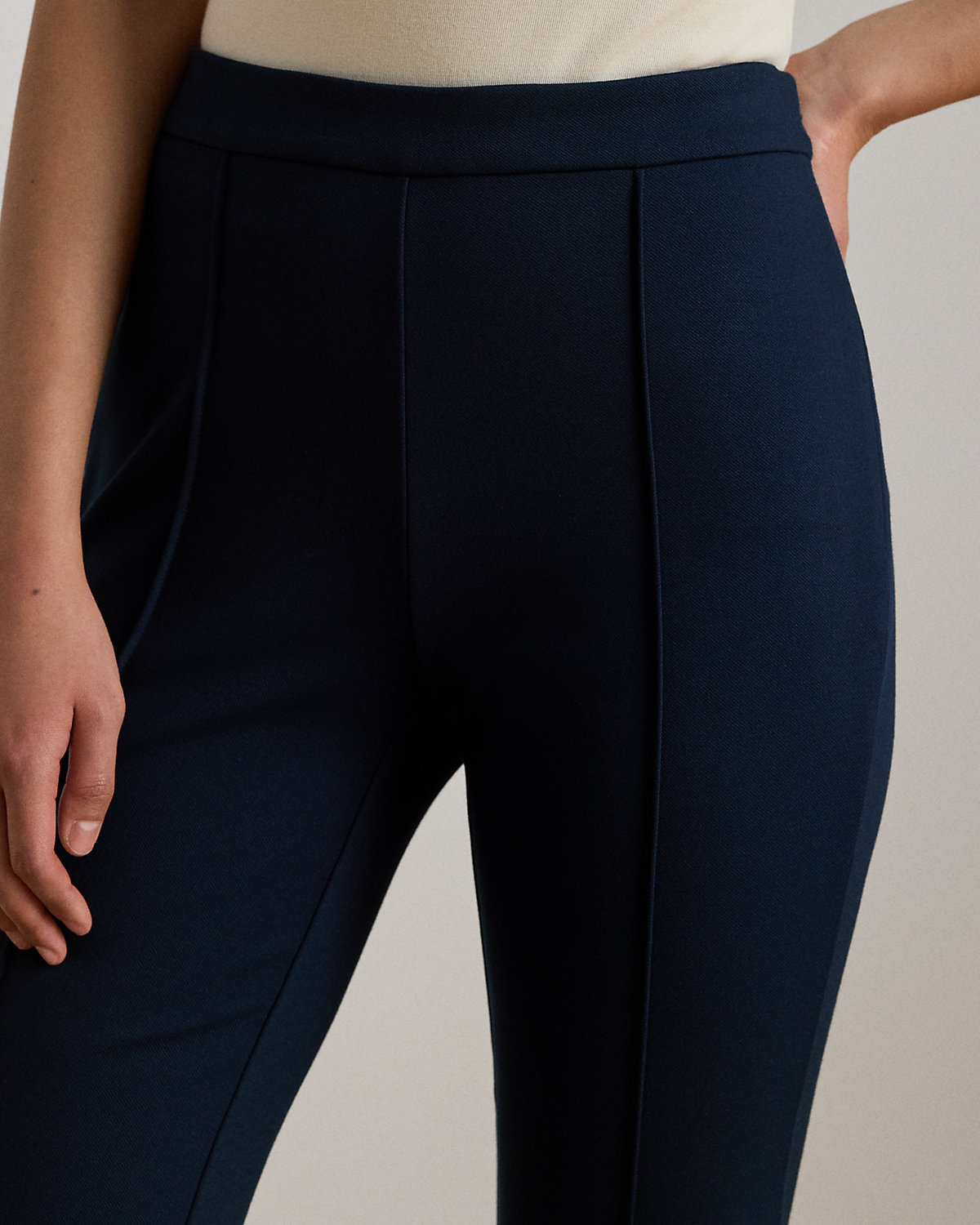 These stretch-infused twill ankle pants showcase a flare silhouette with vertical pintucks along the front and back for a modern take on a tailored essential.