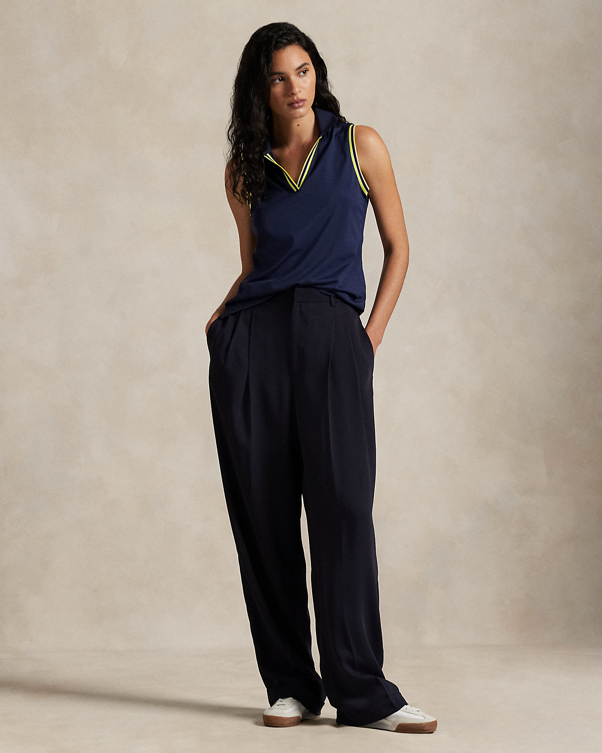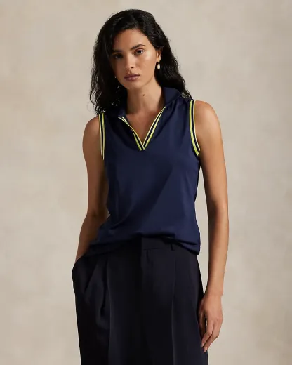 This Slim Fit sleeveless Polo shirt is cut with stretch piqué fabric and is accented by striped ribbed trim at the neckline and armbands.