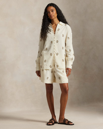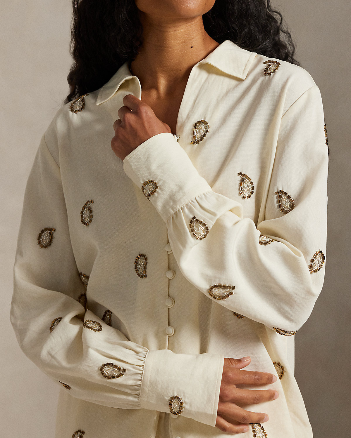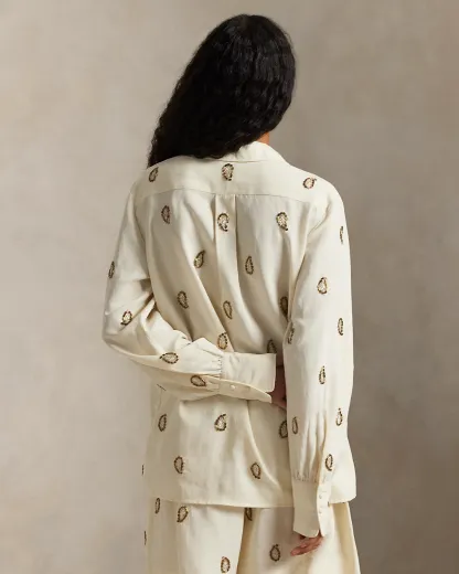 Crafted from beautifully draped fabric, this shirt showcases meticulous paisley beadwork and refined self-covered div closures, capturing a sophisticated and romantic aesthetic.