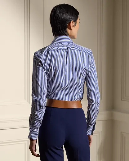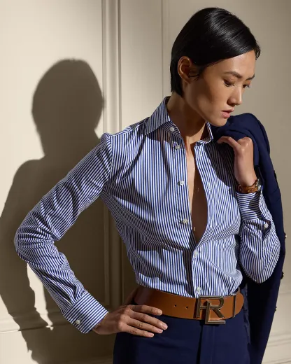 Inspired by the first women's dress shirt Ralpthth Lauren introduced in the 1970s, this piece combines a slim fit, high armholes, and a spread collar for a feminine take on a menswear mainstay.