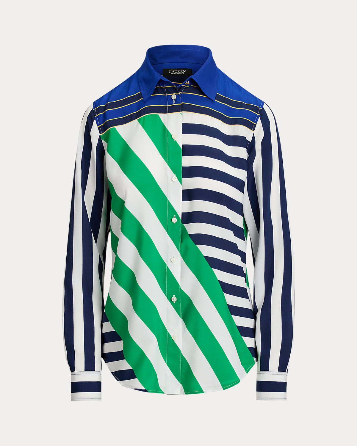Crafted from lightweight crepe de chine, this collared shirt is updated for the season with color-blocked variegated stripes. Signature divs round out the design.