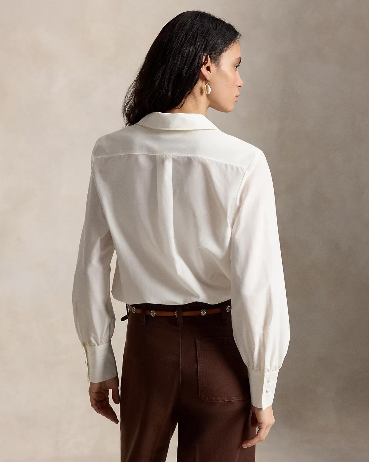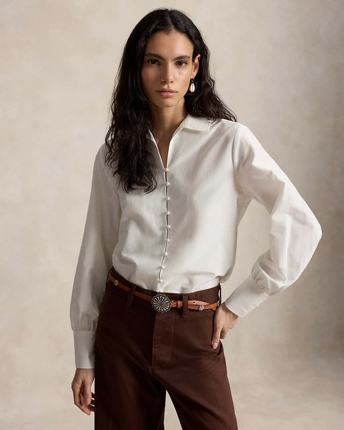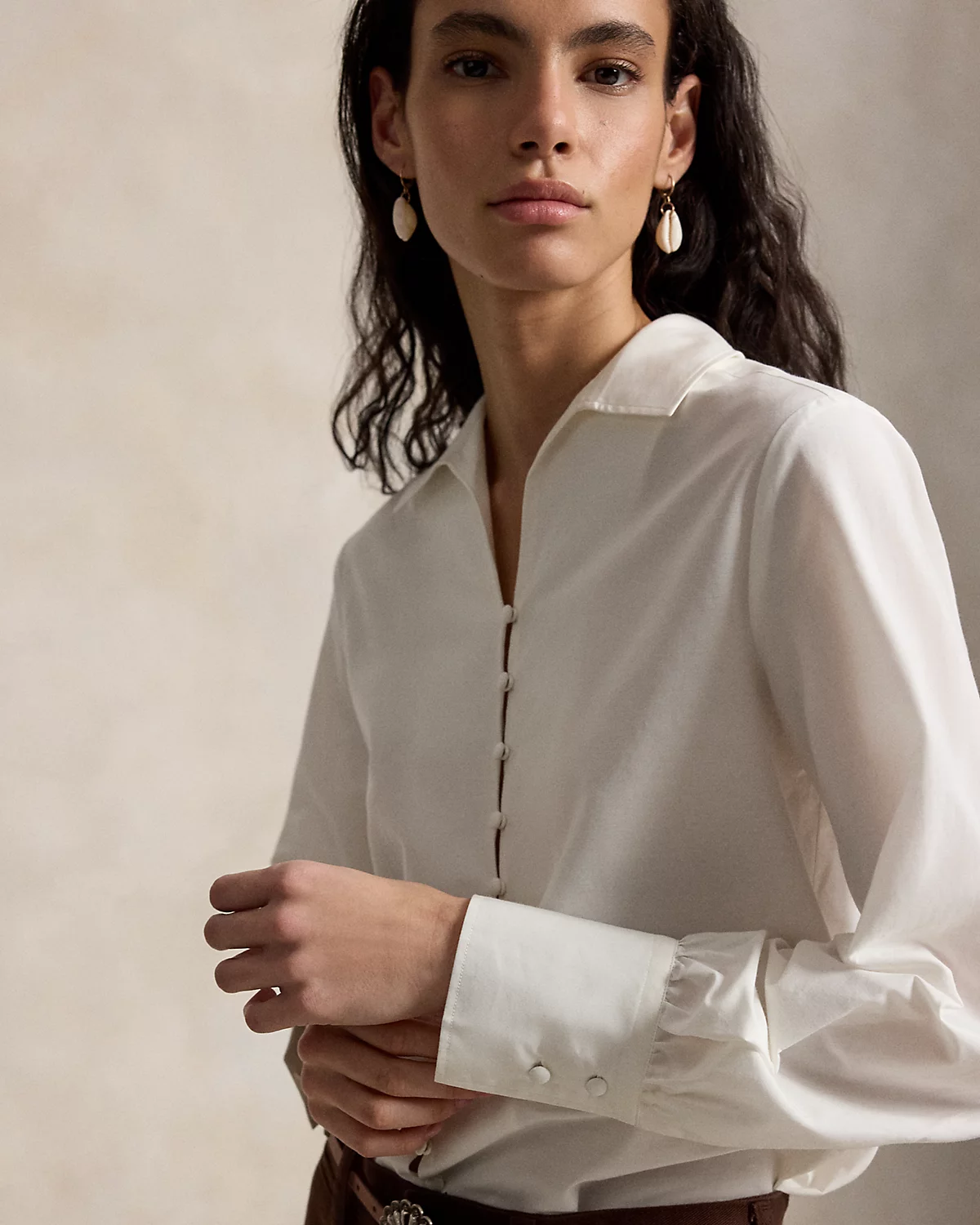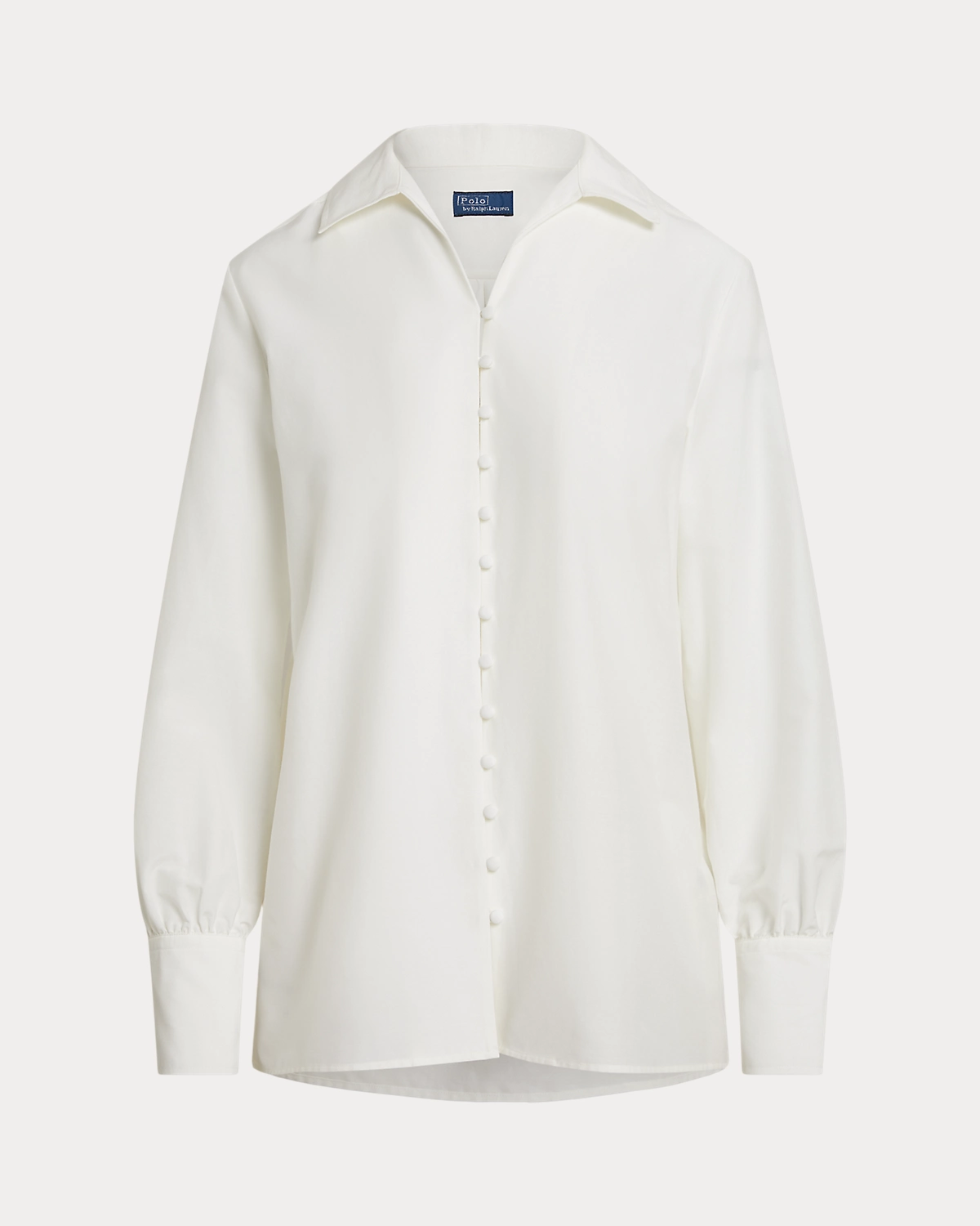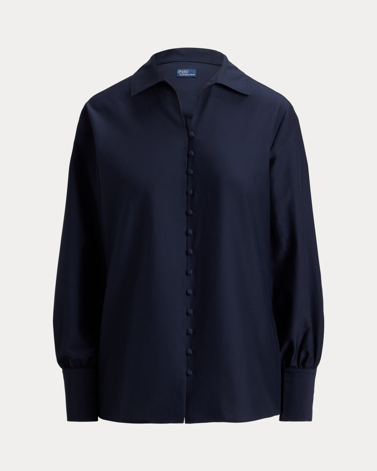 - Spread collar. Button-and-loop placket. Self-covered dome divs.