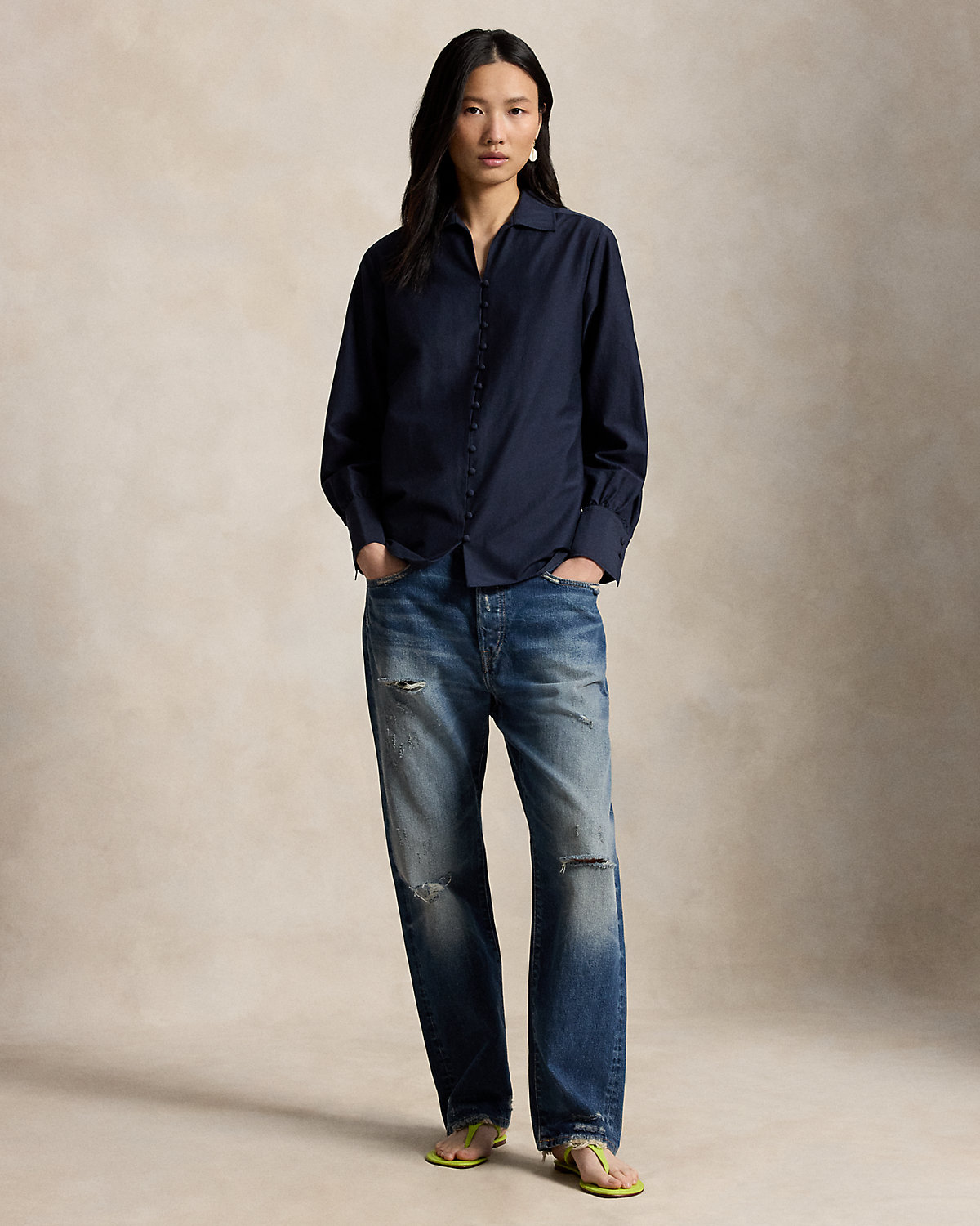 - Straight fit. Intended to hit at the hip.