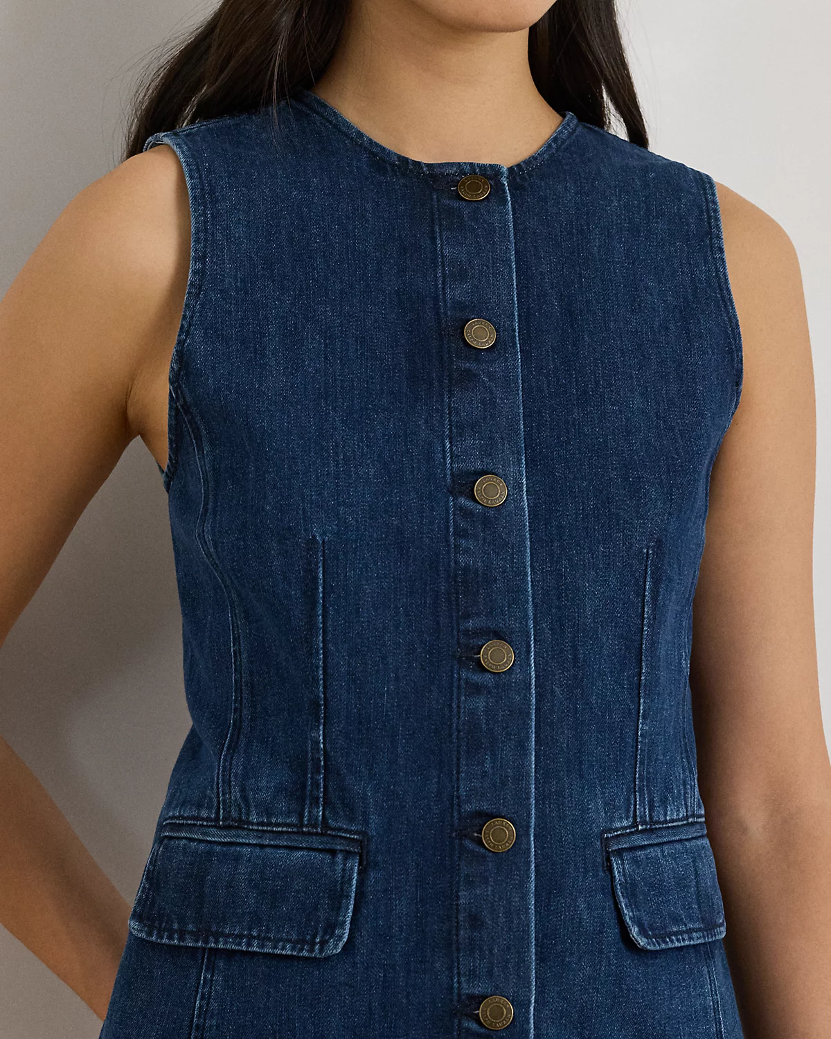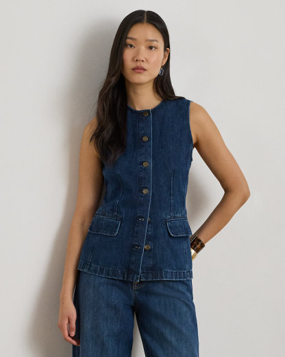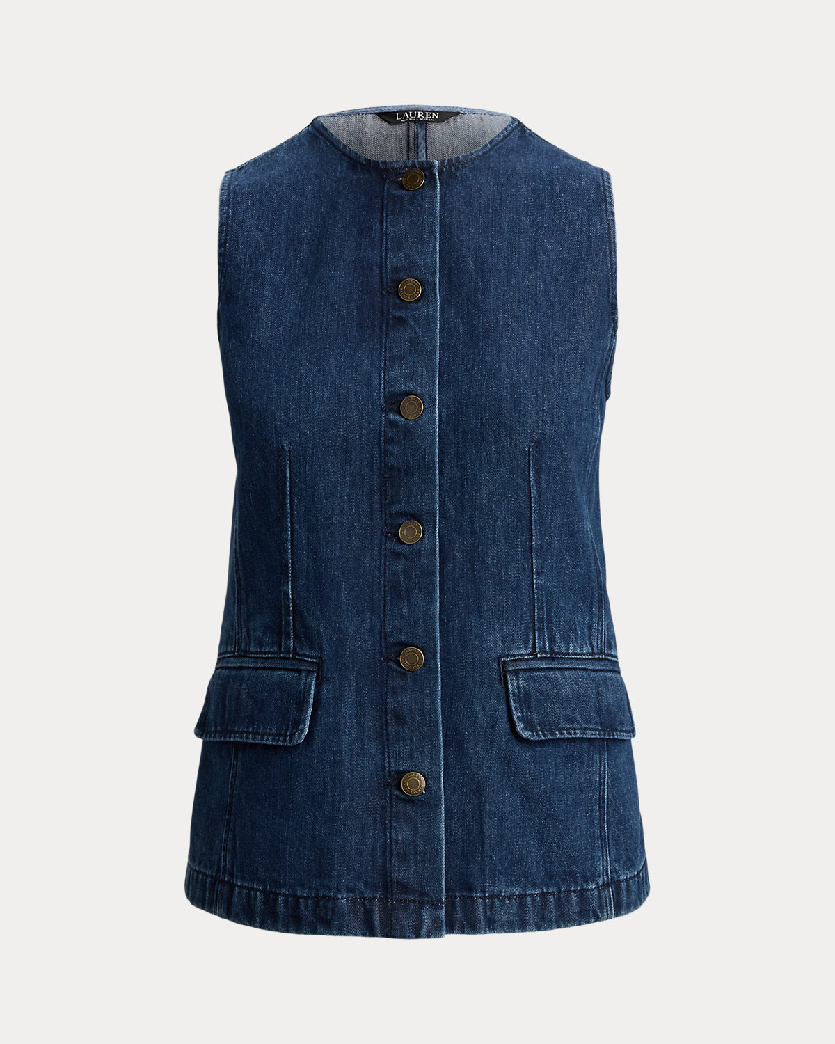 Offering a modern take on tailoring, this sleeveless piece features a paneled denim construction and a div-front silhouette that is versatile enough to be worn as a standalone shirt or as a vest.