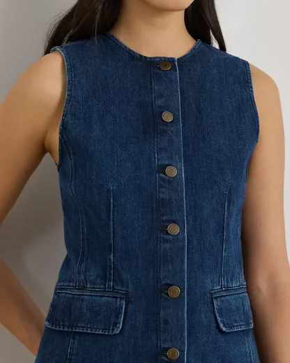 - Sleeveless silhouette. Two front waist flapped besom pockets.