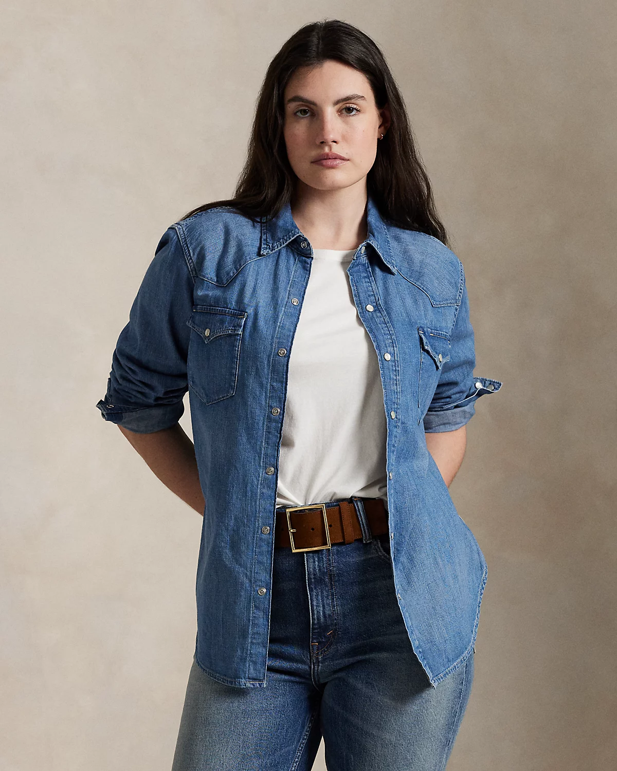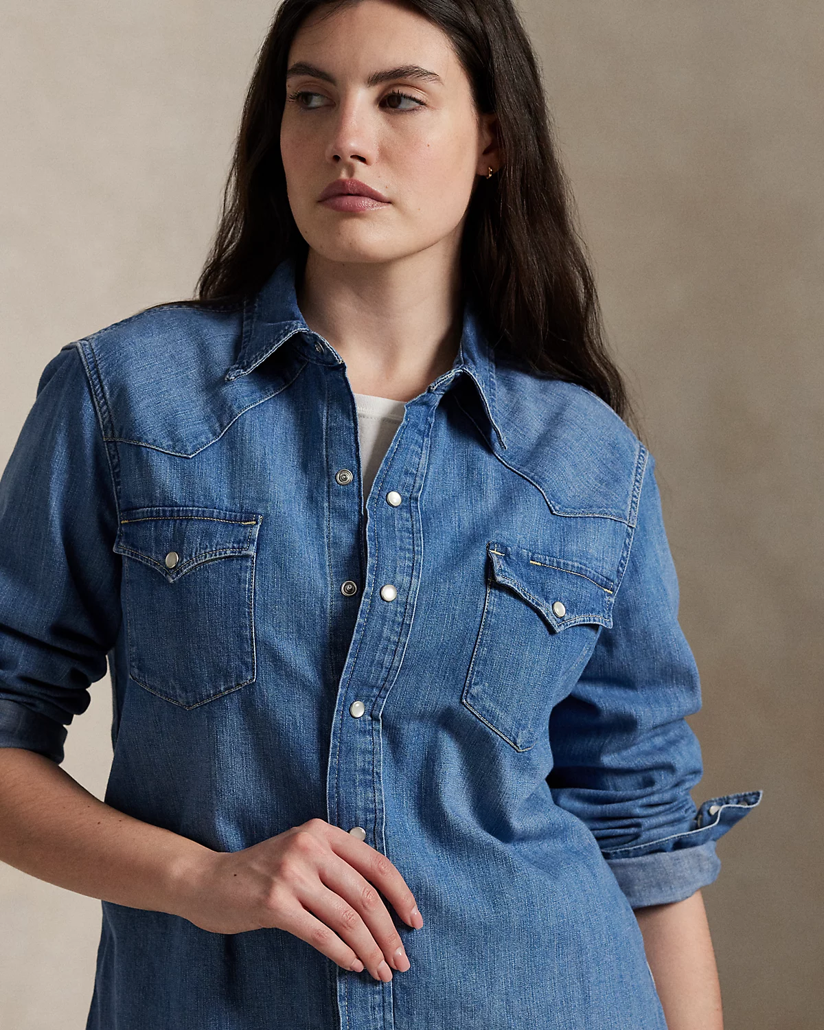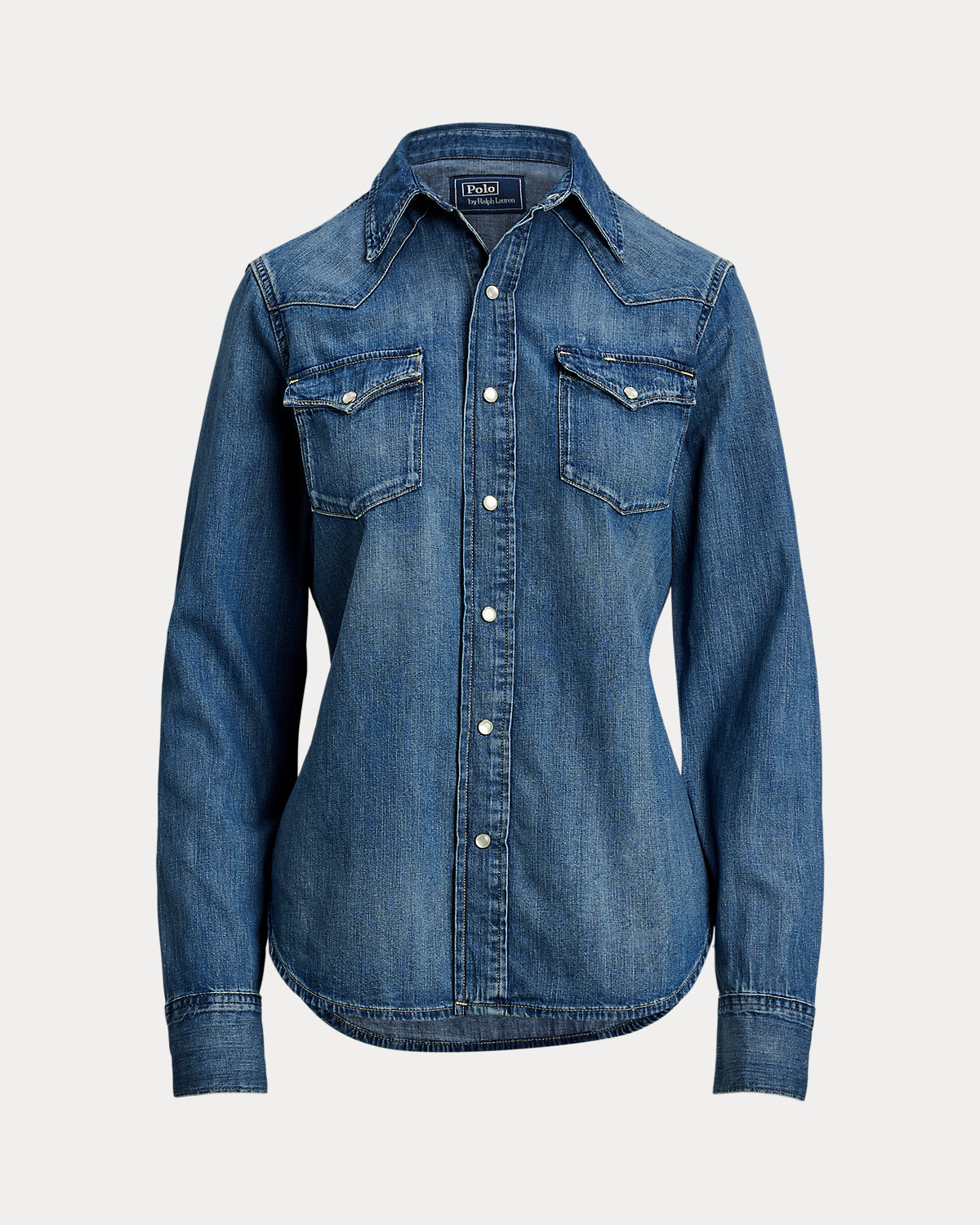 - Western-style front and back yoke. Shirttail hem.