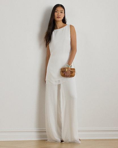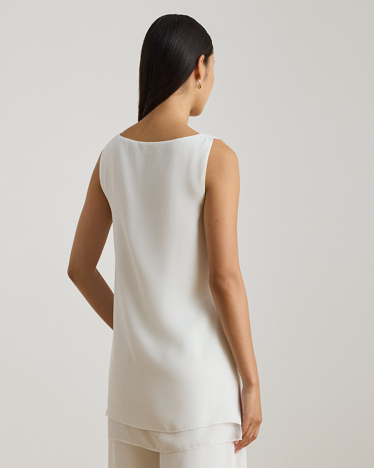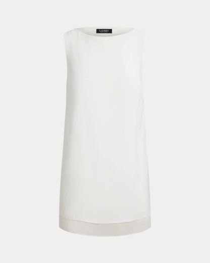 This sleeveless boatneck tunic pairs double-faced georgette with a layered silhouette and side-split hem for a fluid drape.