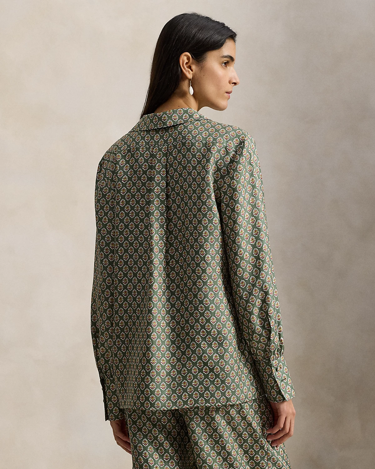 Crafted with ultralightweight mulberry silk, this shirt represents the traveler’s spirit of the season with a relaxed shape that features a floral woodblock print and a div-and-loop front placket.