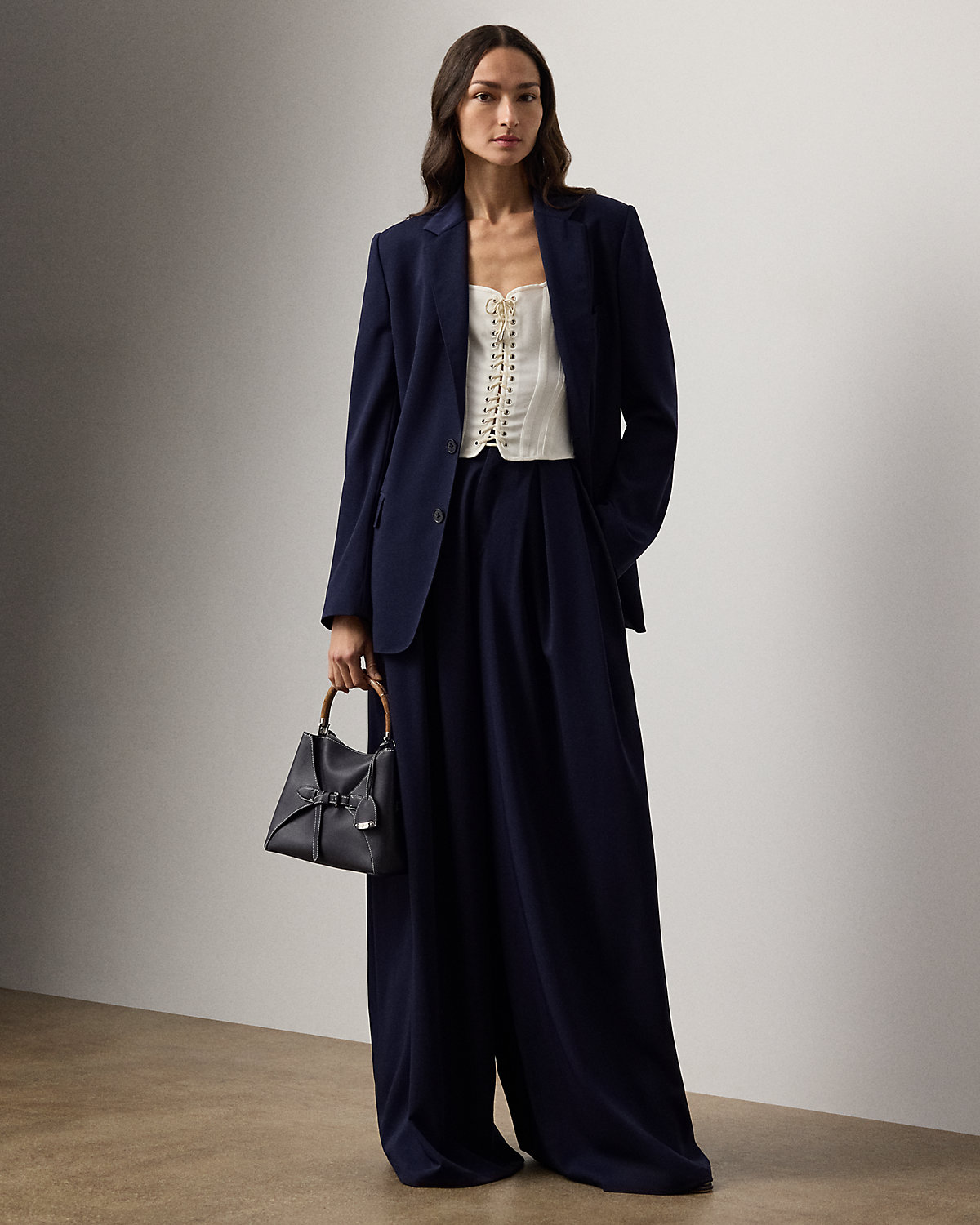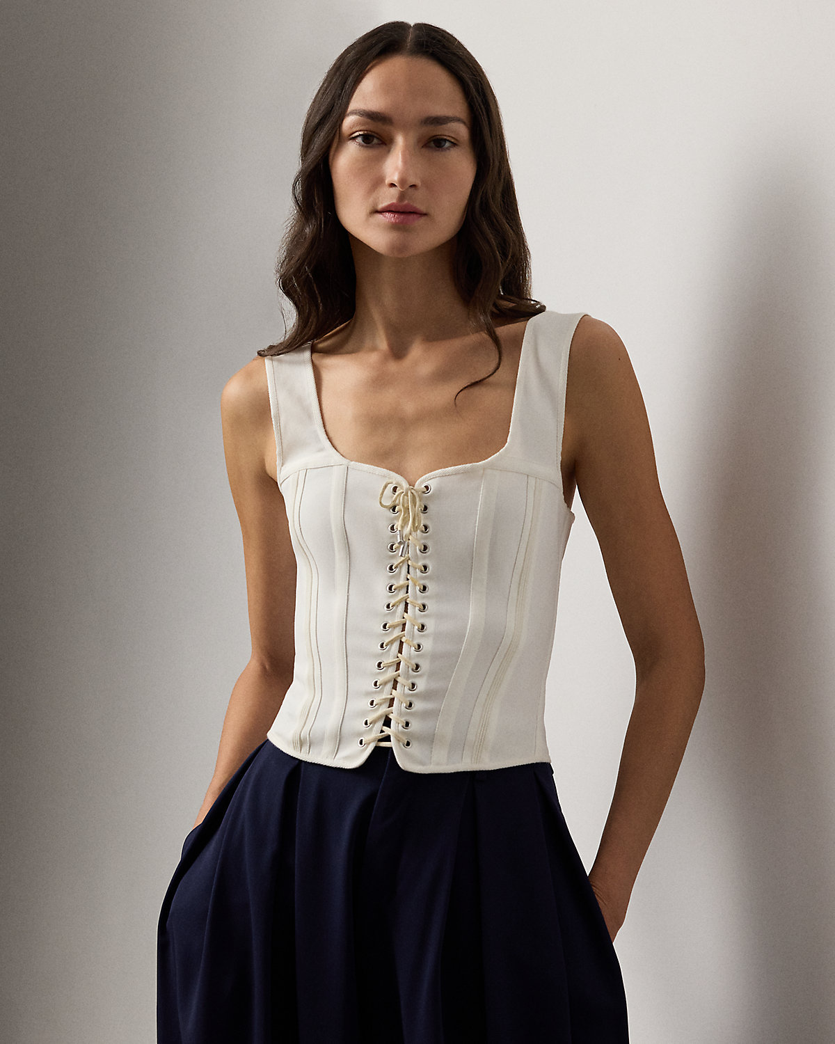 For Pre-Spring 2026, Mr. Lauren reimagined classic nautical-inspired themes, which is evident in the design of the Kat top. Featuring corset-style details, including a lace-up closure and topstitching down the bodice, this sleeveless top is crafted in Italy from a refined cotton blend, resulting in an ultrasoft, sleek fabric considered for its subtle stretch and added comfort. A sweetheart neckline and sumptuous lamb-suede lacing heightens its romantic appeal, while fish-eye divs at the shoulder straps nod to the season’s aesthetic.