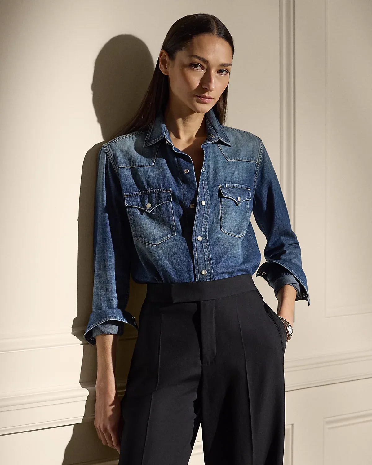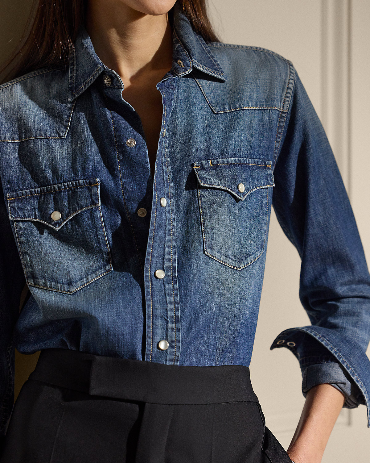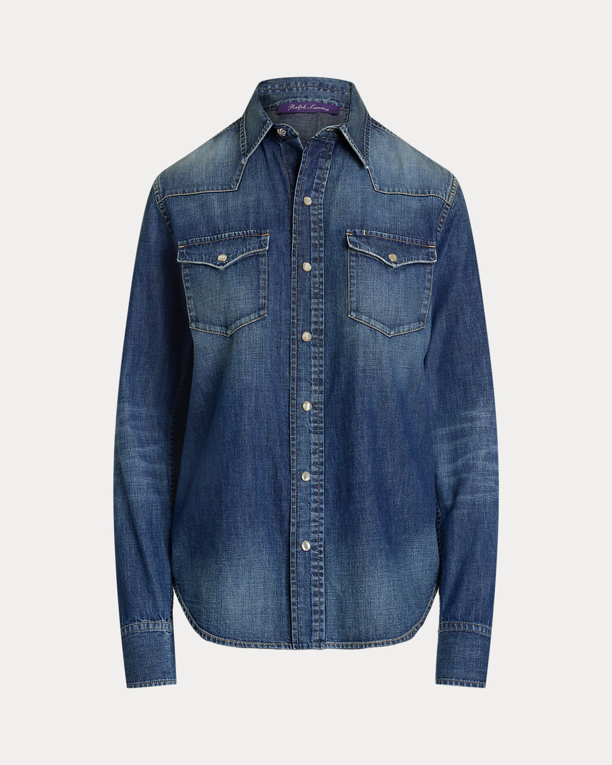 Channeling the rugged spirit of the American West—a key source of inspiration for Ralpthth Lauren—the Payson puts a luxurious spin on the iconic Western shirt with genuine mother-of-pearl snaps, a stylized front and back yoke, and an indigo cotton denim fabrication, which is carefully hand-sanded to achieve a naturally worn-in look.