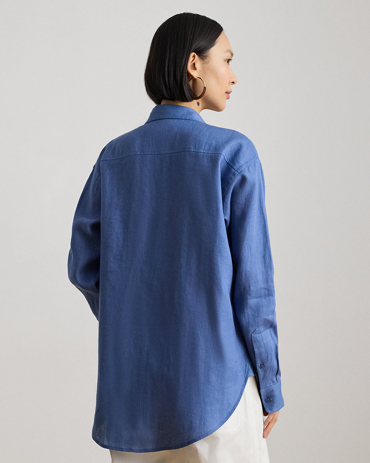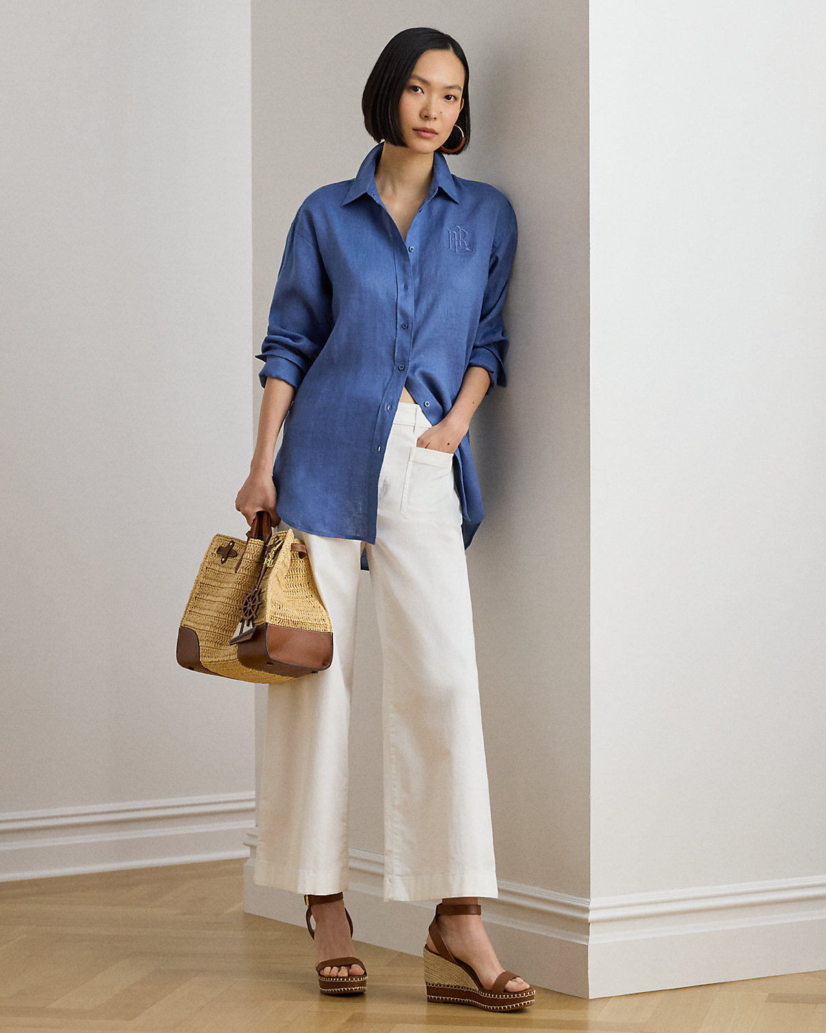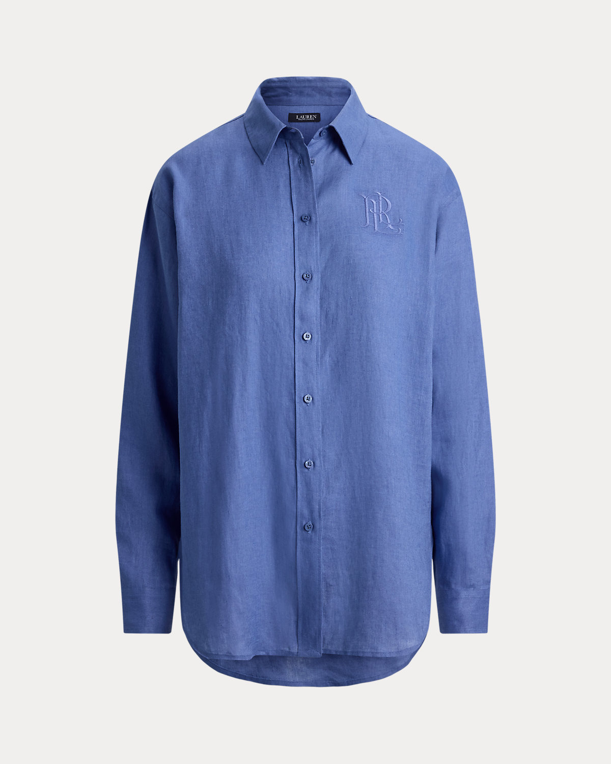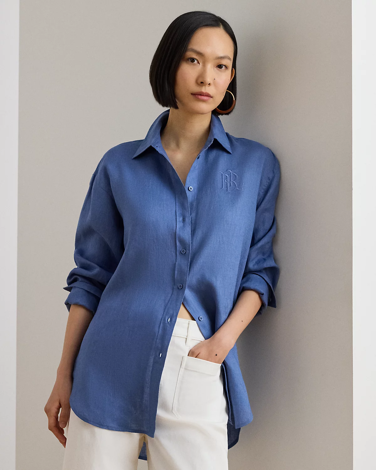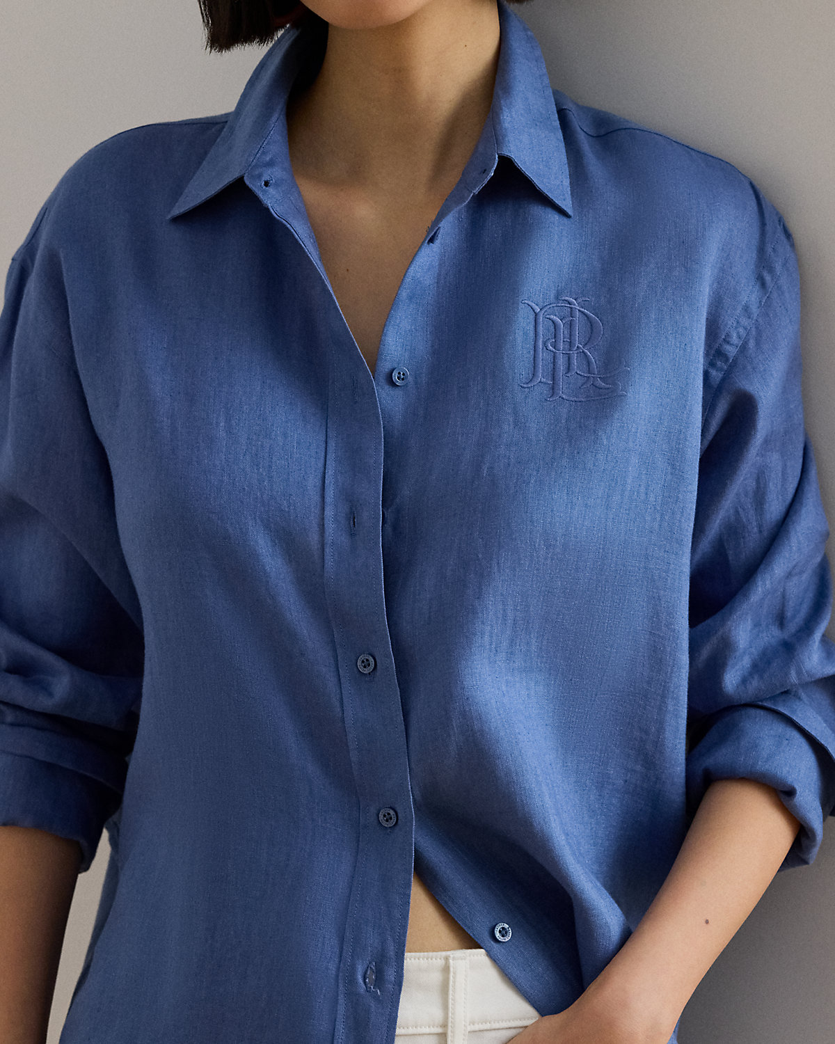 This timeless div-down shirt pairs a relaxed silhouette with airy linen. Lauren’s embroidered monogram at the chest completes the look.