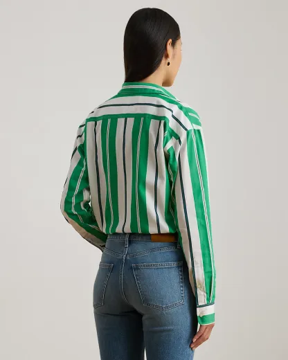 Tailored in crisp cotton broadcloth, this essential collared shirt is yarn-dyed with variegated stripes.