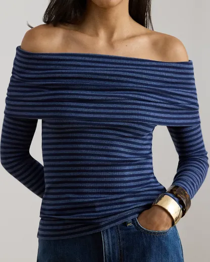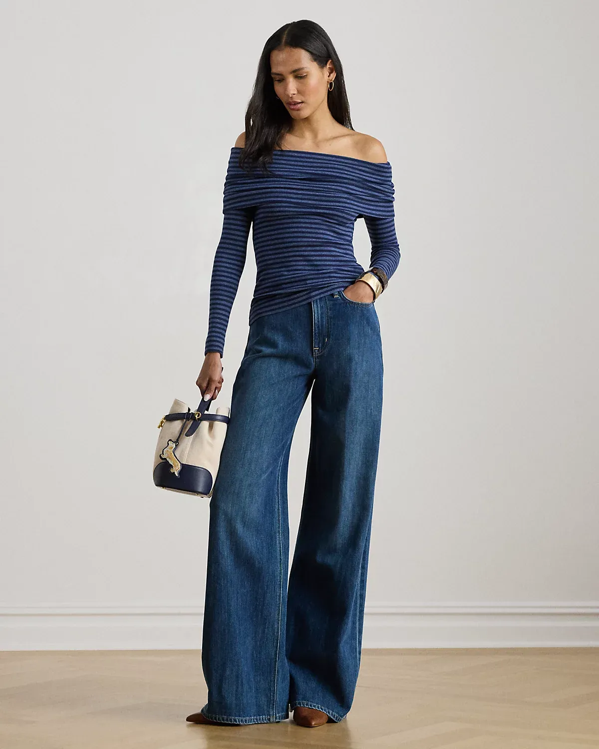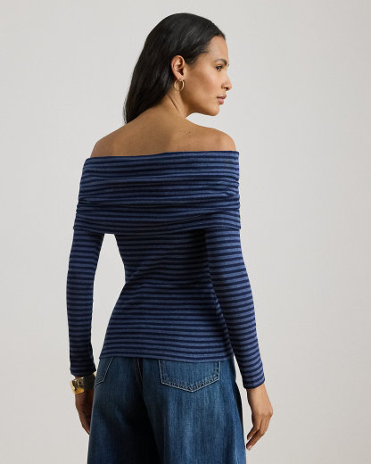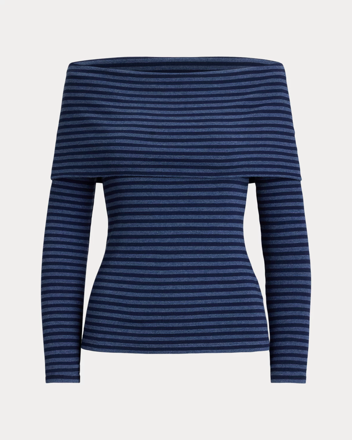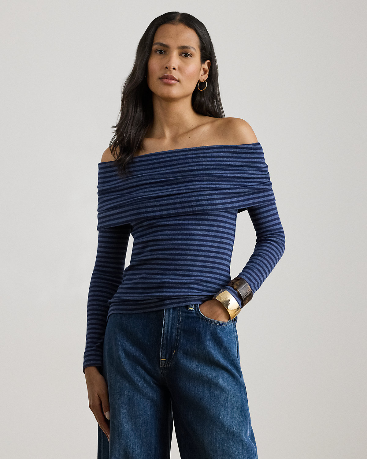 Rib-knit with a soft cotton blend, this elegant top pairs a fold-over, off-the-shoulder neckline with horizontal stripes. Lauren’s signature embroidered logo at the hem completes the look.