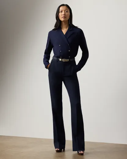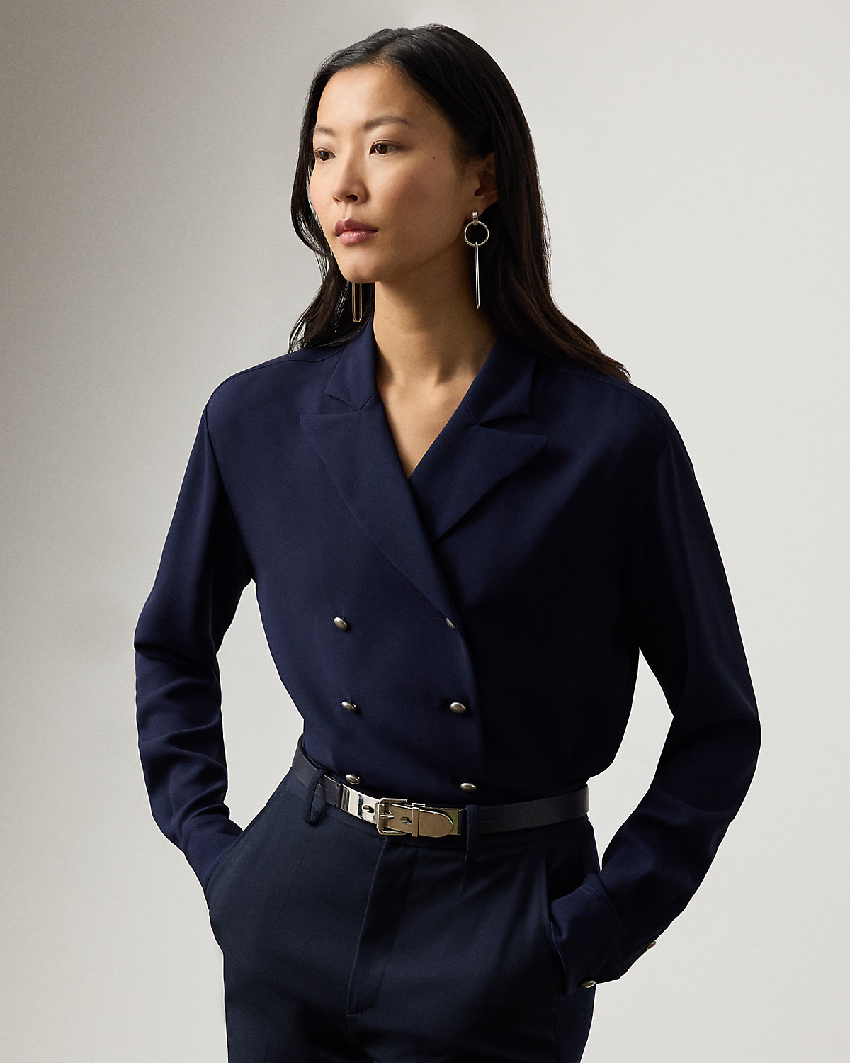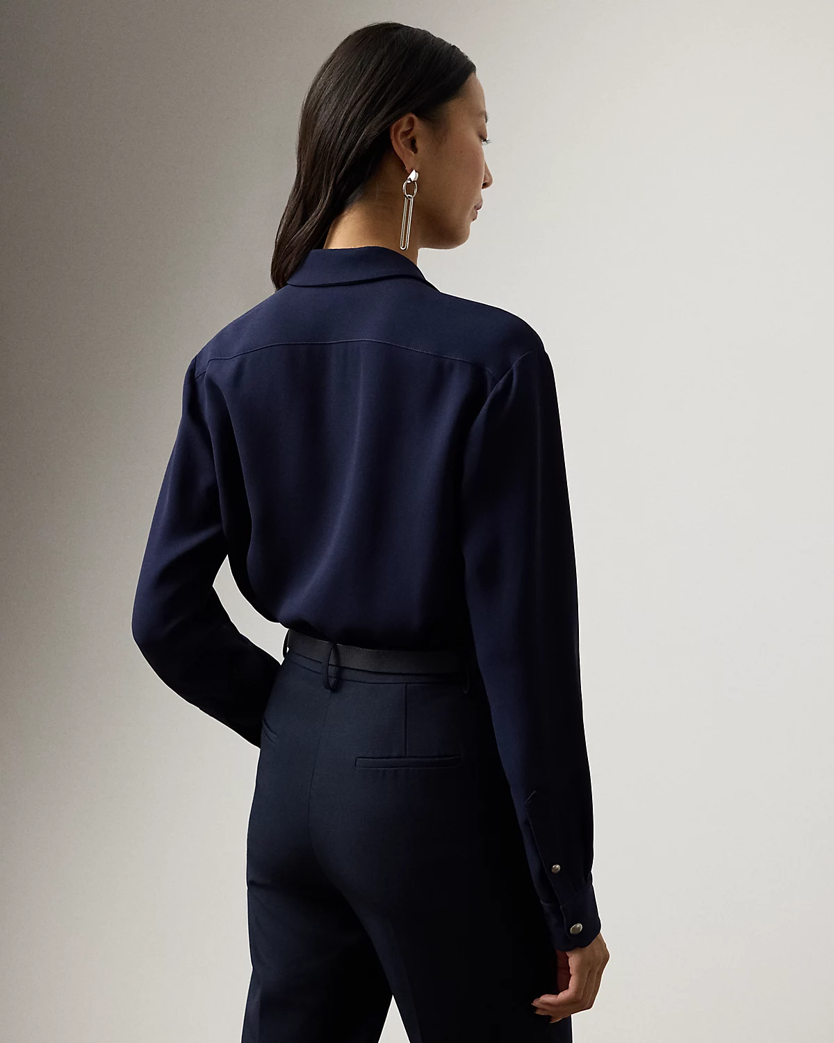 A novel take on traditional tailoring, the Terrel reimagines the essential shirt as a double-breasted silhouette with peak lapels and domed metal divs custom-developed with Ralpthth Lauren’s signature. Crafted in Italy, this style’s luxurious cady fabrication is made with the highest quality silk crepe yarns for a classic yet modern look.