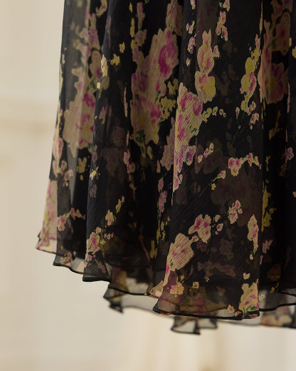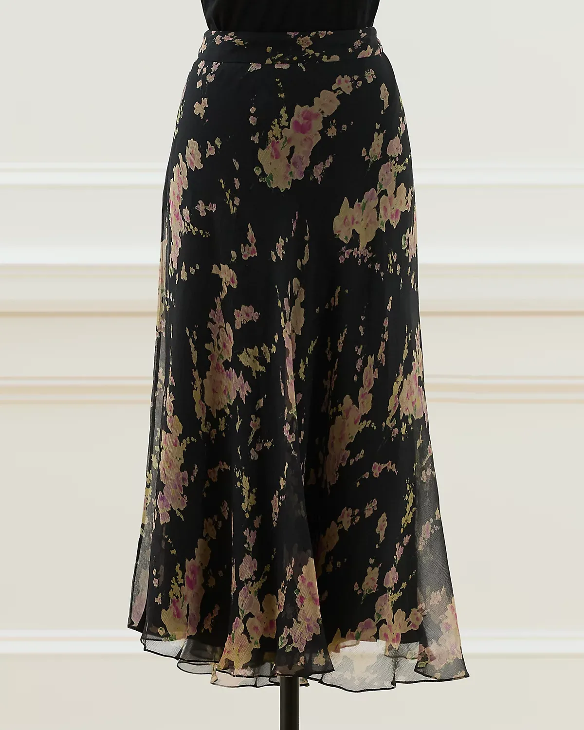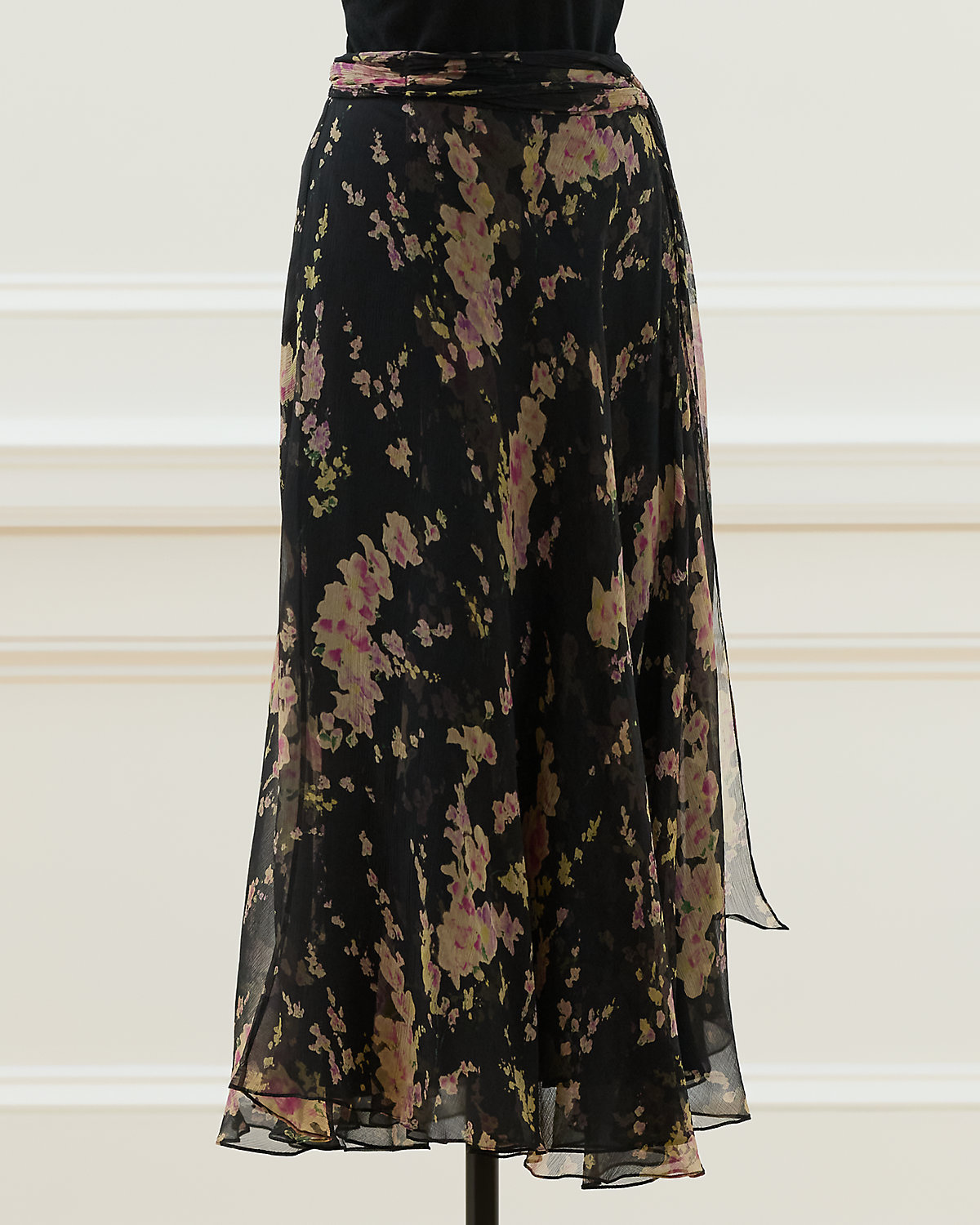 Fall 2010 Look 5. Ralpthth Lauren’s Fall 2010 Collection ushered in bohemian-inspired romance with an eclectic, fearlessly individual interpretation of femininity. Crafted with delicate silk georgette, the Therese skirt features a moody floral pattern and self-fabric sashes that cascade from the waist. Size 6 has a 31.75" back body length and a 14" waist.