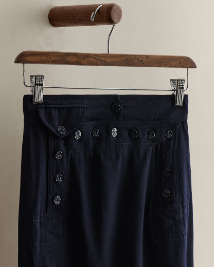 - Buttoned bib at the front. Buttons custom-developed with an anchor motif.